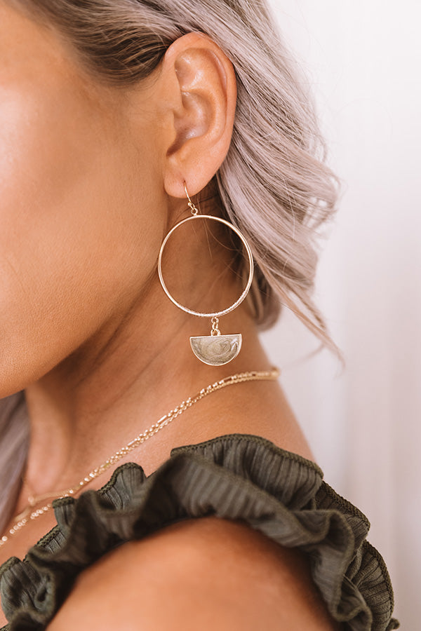 There is no reason you can achieve amazing glam in your "real life" when you accessorize with these adorable statement earrings featuring dainty gold hoops with martini olive colored half-circle charms!