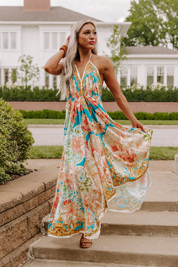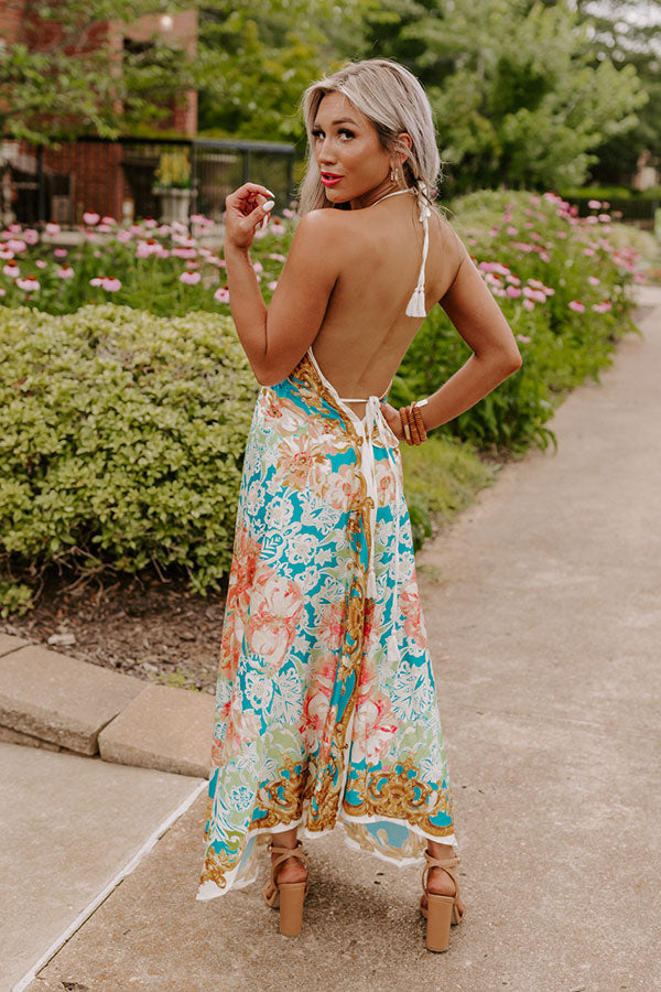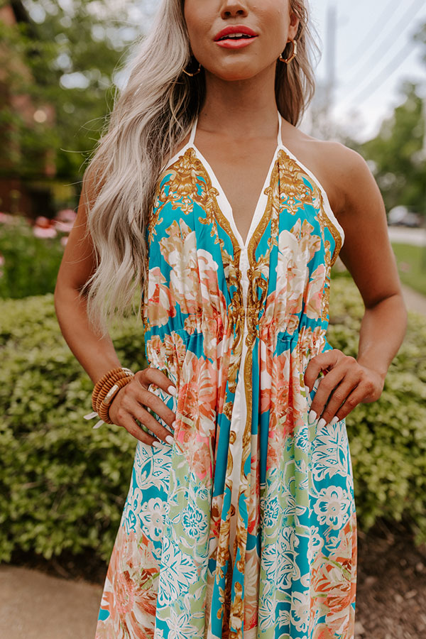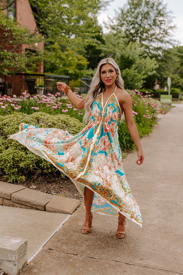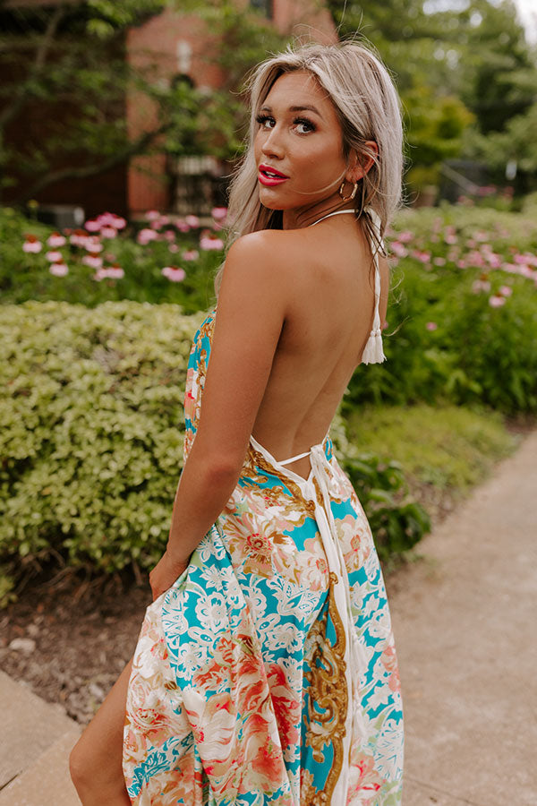 You will undoubtedly look really dreamy in this turquoise midi dress featuring lightweight satin material patterned with a beautiful baroque print, a v-cut neckline with a halter tie closure, a low open back with a tie closure and a relaxed silhouette that falls into an uneven mid-calf length hemline!