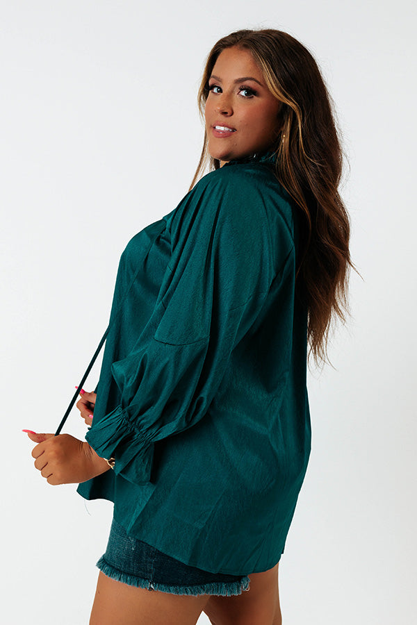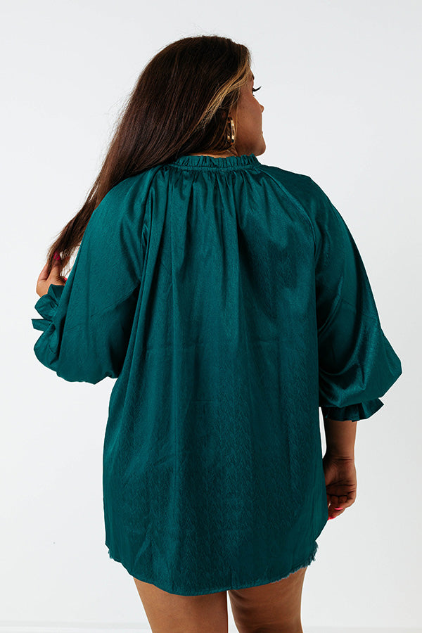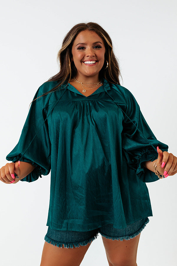 Perfect for dressing up or down, our classy teal colored plus size 'Really Dreamy Shift Top' features sleek lightweight material, a subtly ruffled rounded neckline with a tie closure v-notch accent, 3/4-length bishop sleeves with flared cuffs, and a relaxed silhouette that falls into a rounded hemline!