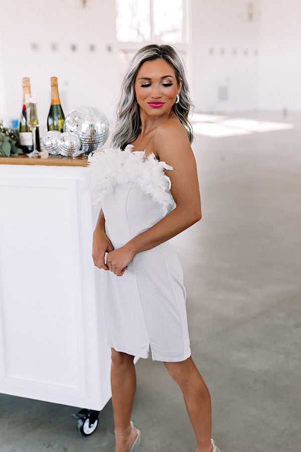 You won't need a reason to party when you wear this striking champagne colored dress featuring lightweight material, a strapless feather bodice, a zip closure in the back, and a flattering figure hugging silhouette that ends in a straight mid-thigh length hemline!