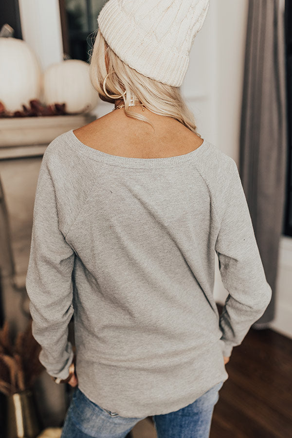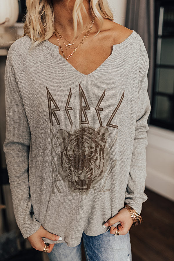 Let your style run free in our vintage stone/grey hued 'Rebel Tiger' top featuring soft and warm thermal material with a cute brown tiger graphic and lettering on the front, a split-neckline, long loose sleeves, and a slouched silhouette that falls into a straight hemline!