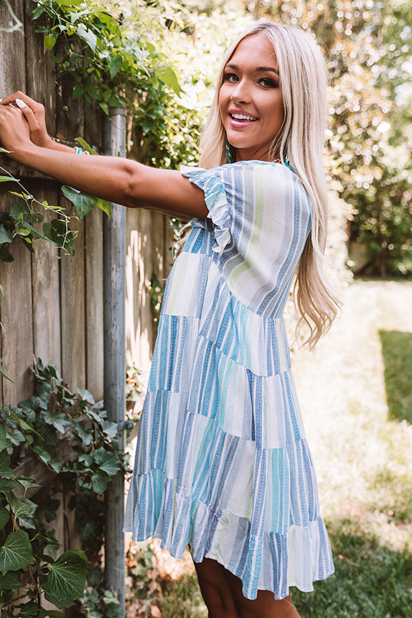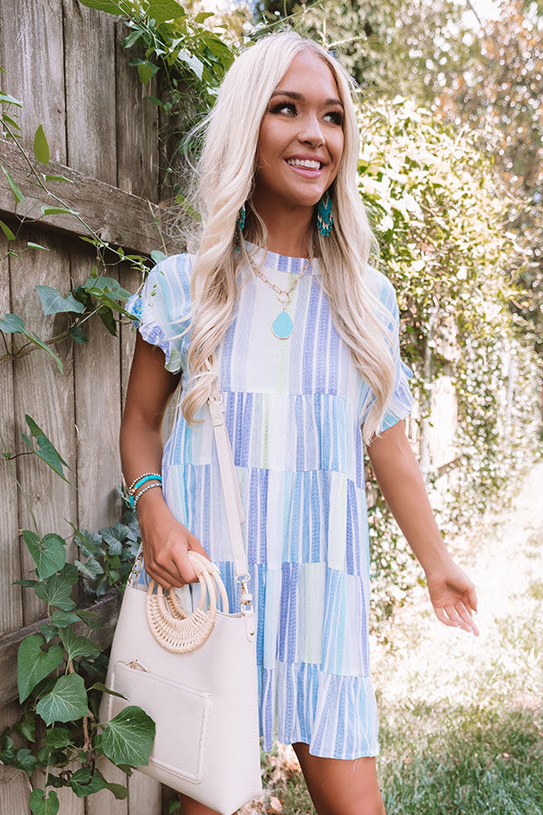 "Stripe" a pose in our charming "Recalling Happy Memories" dress featuring lightweight breezy material patterned with blue hued vertical accent stripes, a high rounded neckline, short loose sleeves with ruffled trim detailing, a keyhole accented upper back with a button closure, and an ultra relaxed tiered babydoll silhouette that falls into an uneven mid-thigh length hemline! We have styled this beauty with some matching statement jewelry and a white peep toe bootie and faux leather tote, but you can also wear it with "The Bowen Wedge in Blue" and our "Plans In Paris Wool Hat in Cream!" Measurements