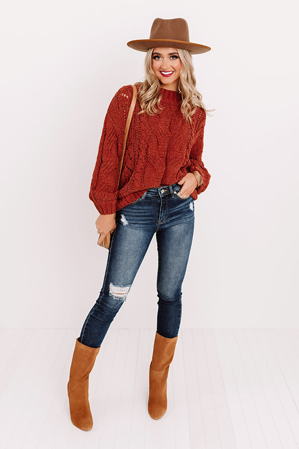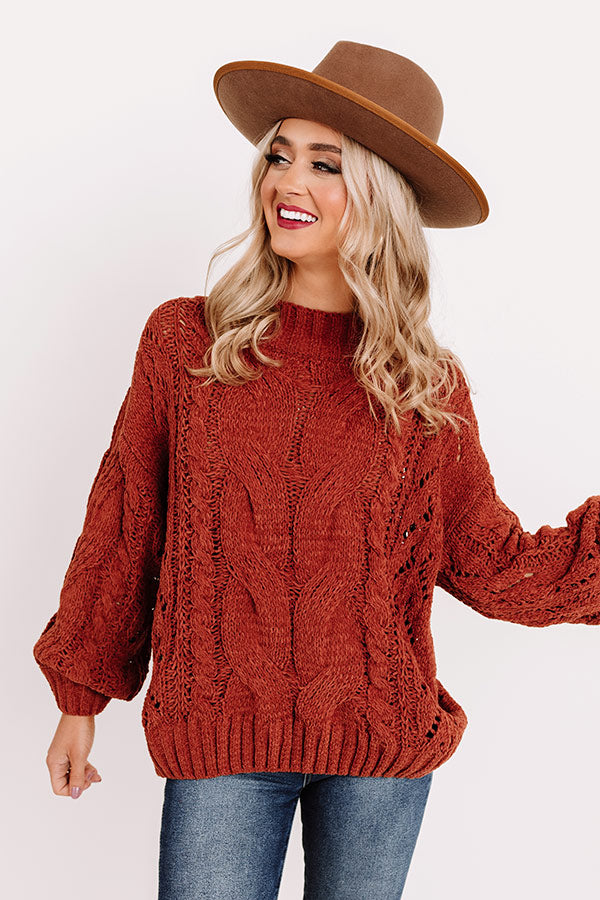 The ultimate recipe for cuddles must include a cozy fall sweater and this dark rust hued one is perfect with its soft chunky material, cable knit texturing, a high rounded neckline, long loose sleeves with fitted cuffs, and a slouched silhouette that falls into a straight hemline!