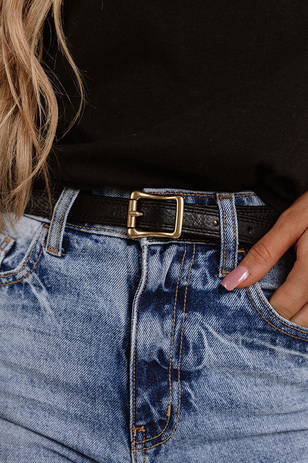 Add something special to any OOTD with our simple black 'Record Label Belt' featuring a skinny strap with a vintage gold buckle!