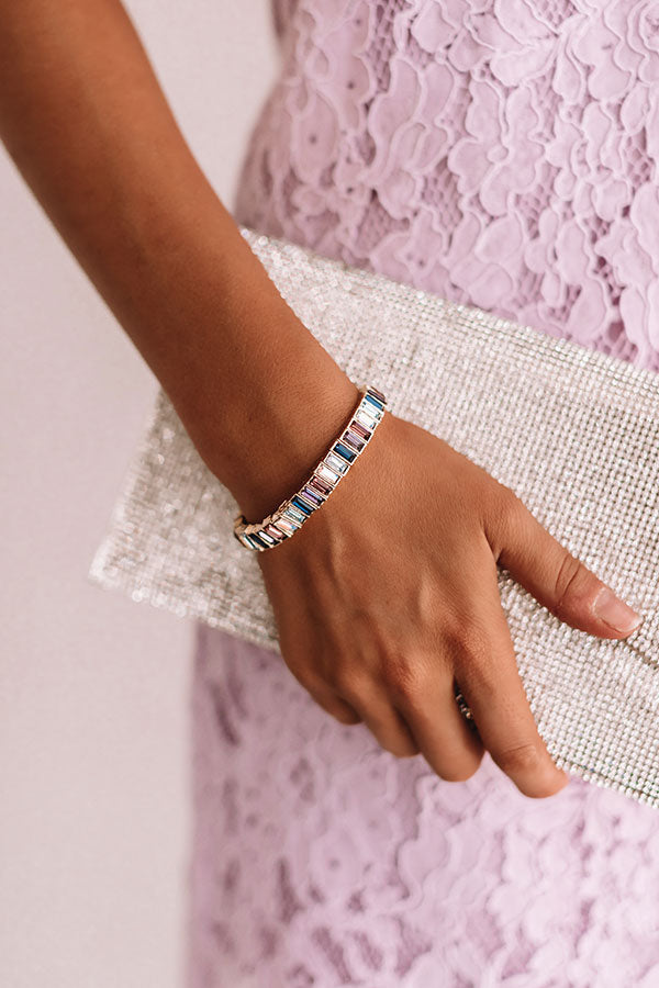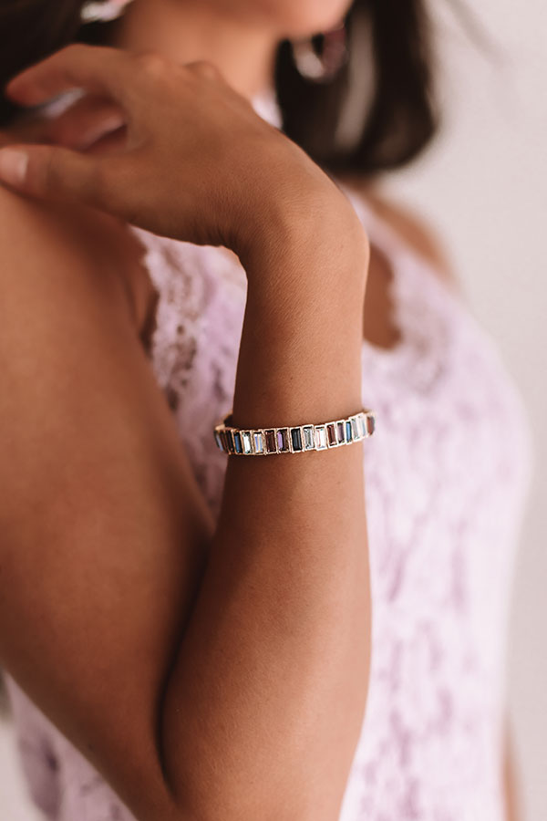 This shining bracelet is so elegant and stunning with its purple multi colored rectangle gems placed inside a gold setting that it can be worn to any "red carpet even!"
