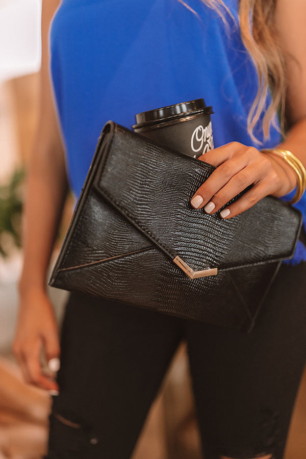 You will not find a better bag for a "red carpet event" than this black clutch featuring a faux leather texture, a snap closure with an envelope flap, two spacious pouches with a zip pocket, and a removable gold chain link shoulder strap!