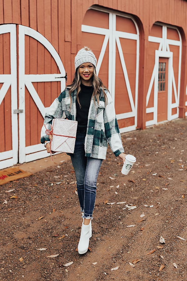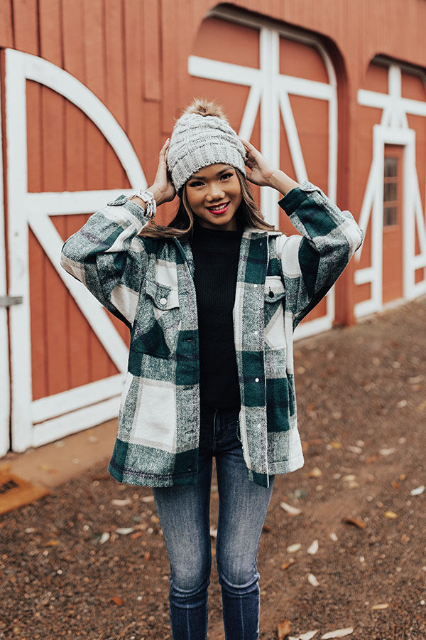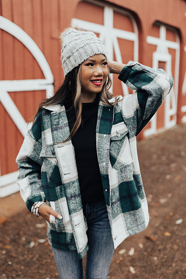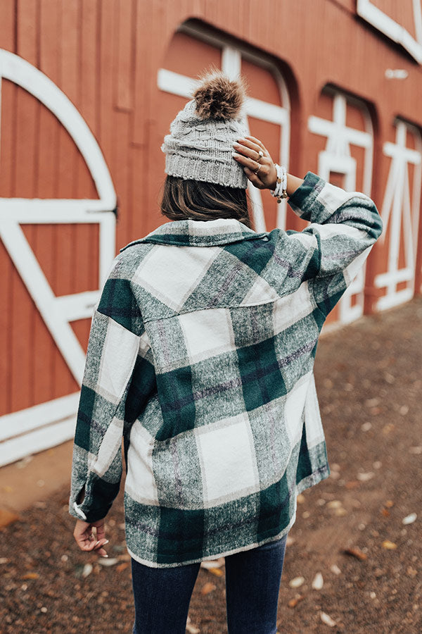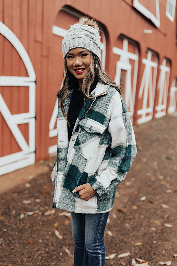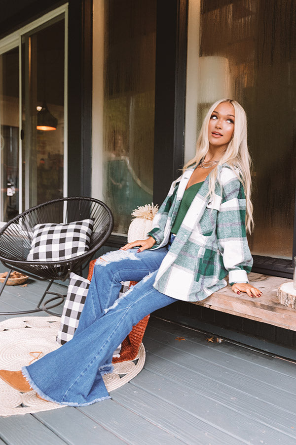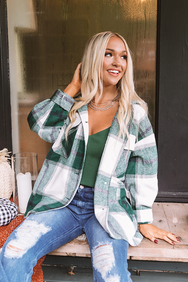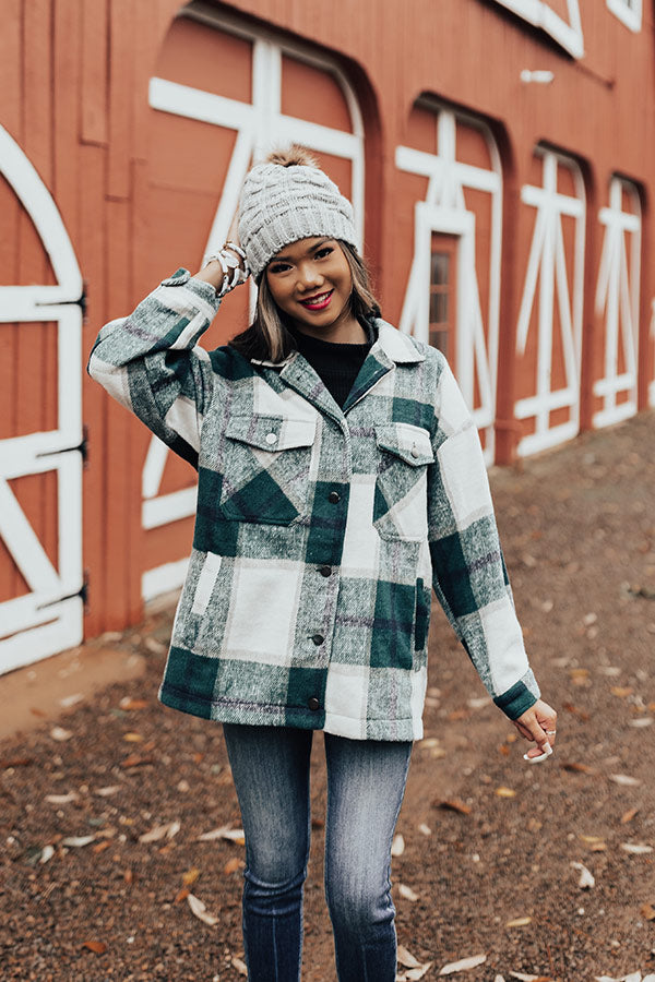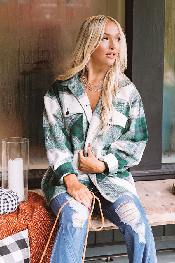 Take on any fall adventure in style with this adorable warm jacket featuring soft thick material patterned with a large green plaid print, long loose sleeves with fitted button closure cuffs that can be rolled, accent chest pockets with flap closures, low side pockets, a button down front with a collared neckline, and a relaxed silhouette that falls into a straight hemline! Measurements