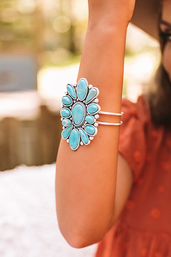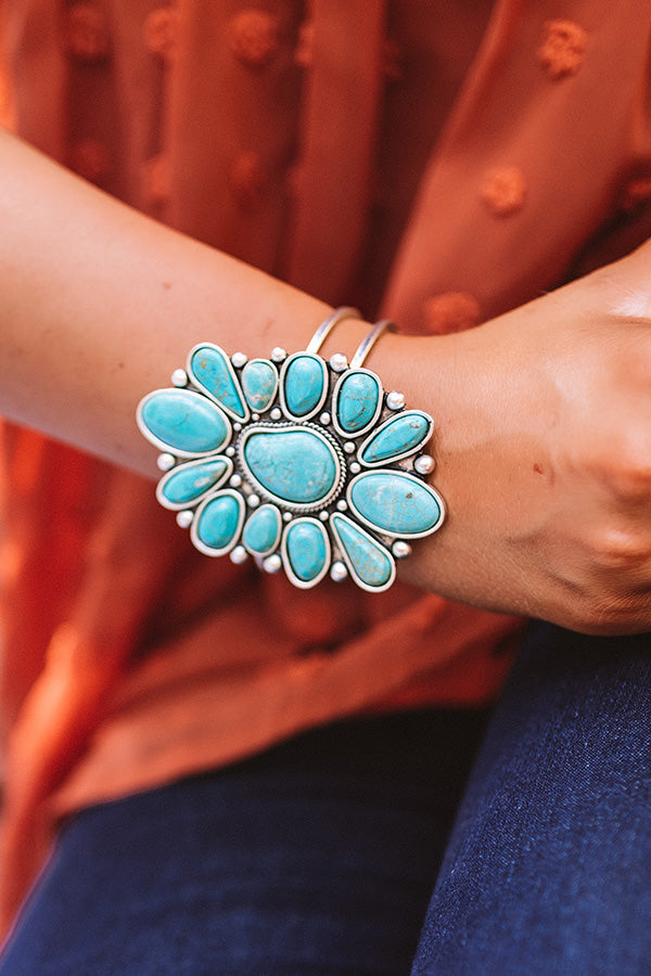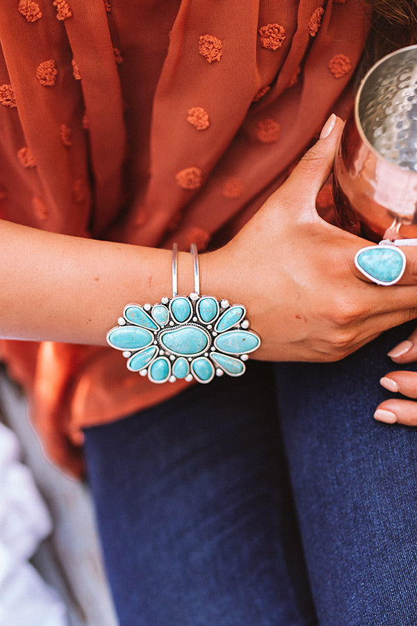 We know you will have strong feelings about how stunning this statement bracelet is featuring a large cluster of turquoise stones set on a vintage silver cuff!