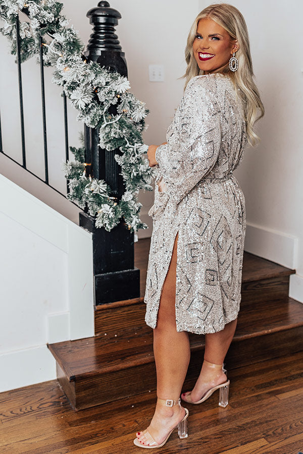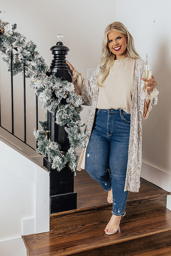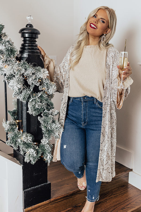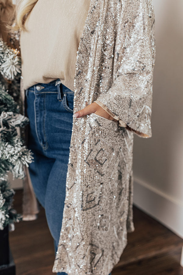 You are guaranteed to look so regal in this elegant plus size duster featuring shimmering silver sequin detailing throughout, loose 3/4-length sleeves, a matching belt, front pockets, and a draped open front silhouette that falls into a straight mid-thigh length hemline with accent side slits! Measurements