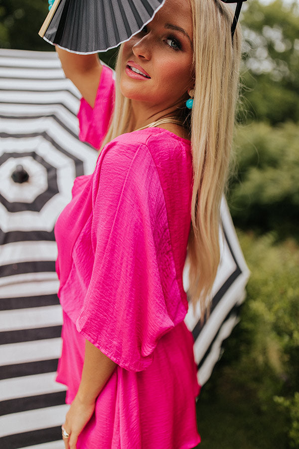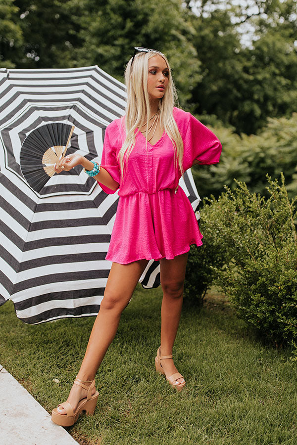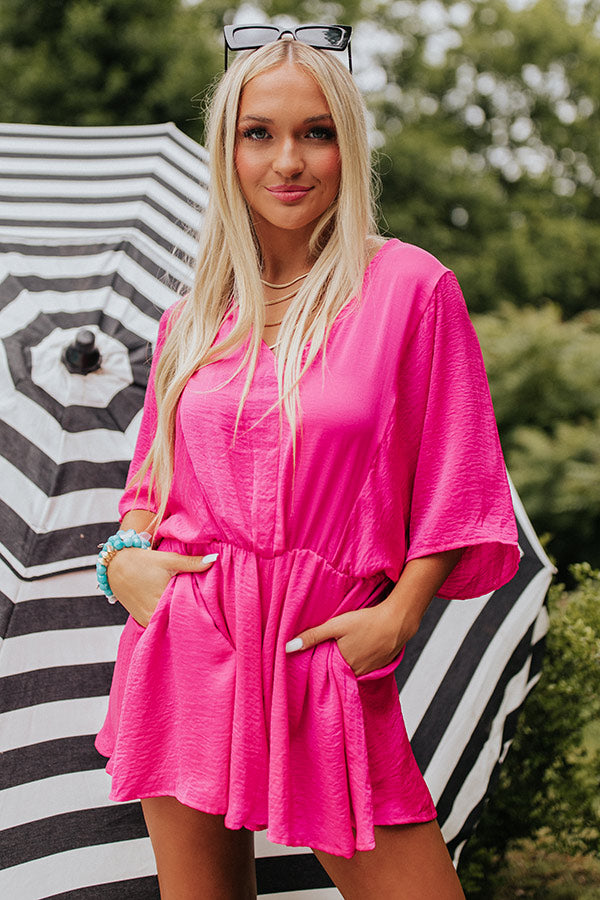 You are guaranteed to have a regal night when you wear this gorgeous hot pink romper featuring lightweight satin material, a v-cut neckline, flowy half sleeves, a cinched waistline, a keyhole accented upper back with a button closure, hidden side pockets, and a relaxed shorts silhouette that falls into an uneven upper-thigh length hemline! Measurements