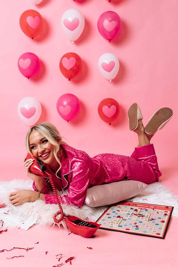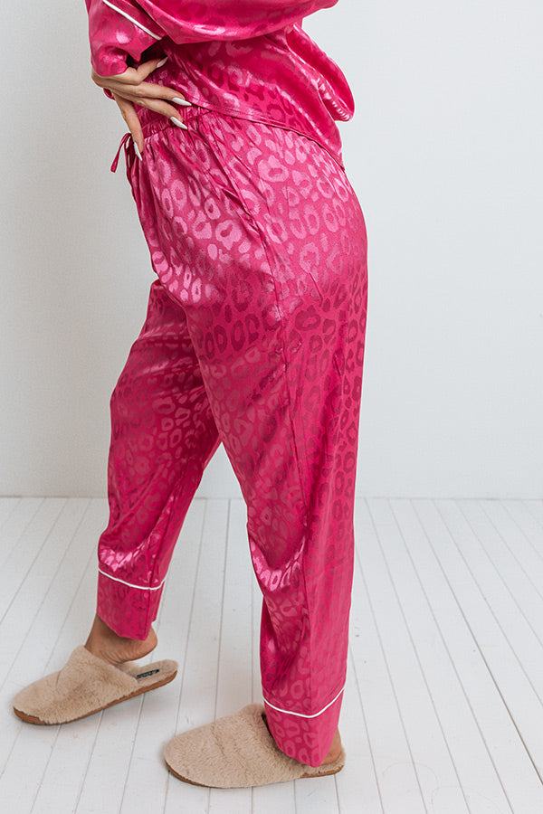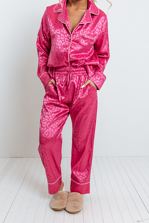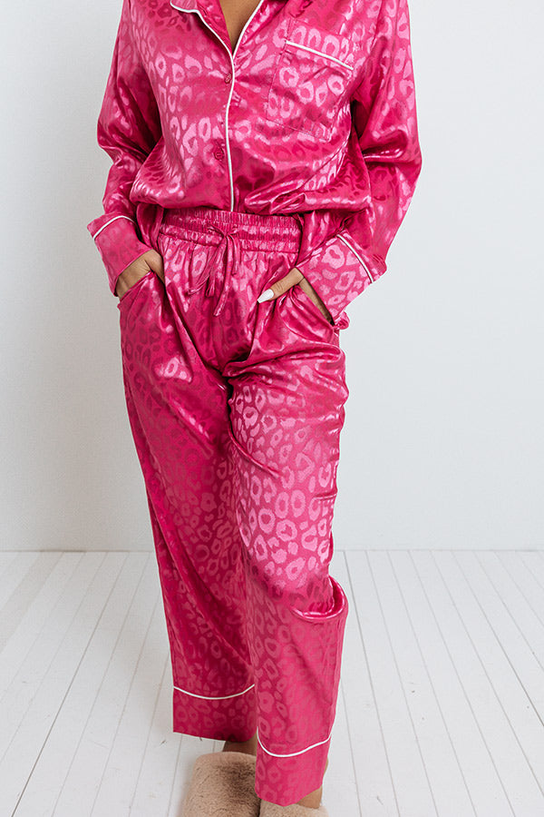 Spend a relaxing Valentines Day evening in with this adorable hot pink pajama top featuring lightweight satin material patterned with a subtle leopard print, an elastic waistline with a tie closure, accent side pockets, and a relaxed silhouette that falls into straight ankle-length hemlines!