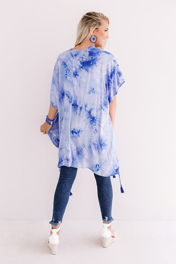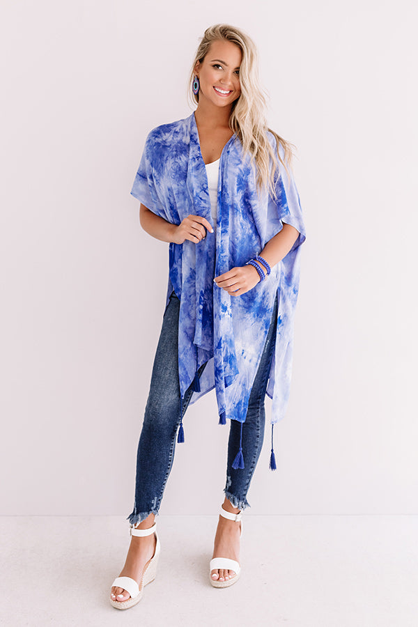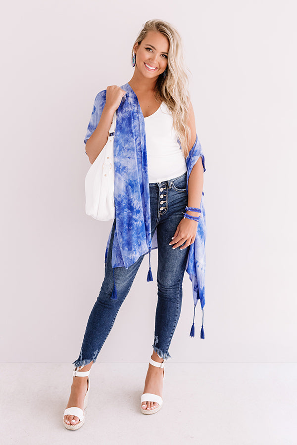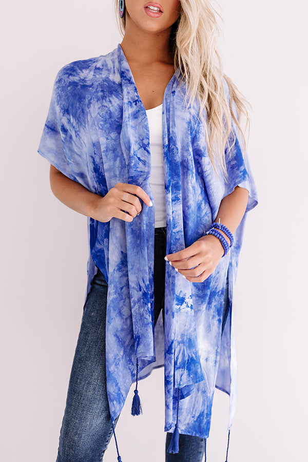 You won't find a better piece to wear while "relaxing poolside" than this adorable overlay featuring ultra lightweight material patterned with dark periwinkle colored tie dye, short loose bat wing sleeves, and a relaxed open front silhouette that falls into an uneven hemline with tassel trim detailing an high accent side slits! You can pair this versatile piece with just about anything from a basic tank and distressed denim to your fave swimsuit!