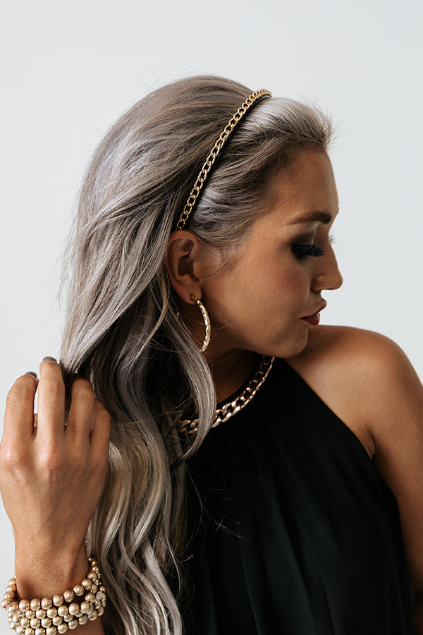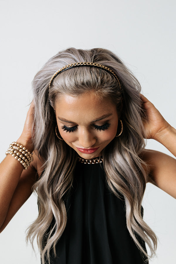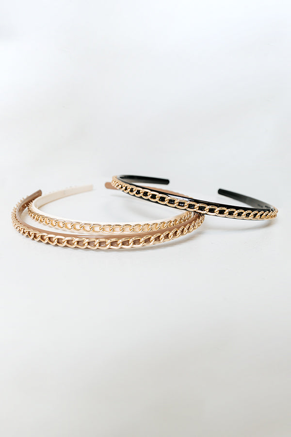 Add a subtle touch of luxury to any look with our high end 'Remix It Headband Set' featuring three pieces with a gold chain detail: a black, white, and light brown one!