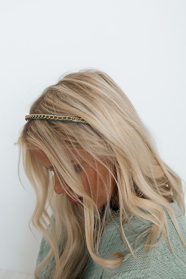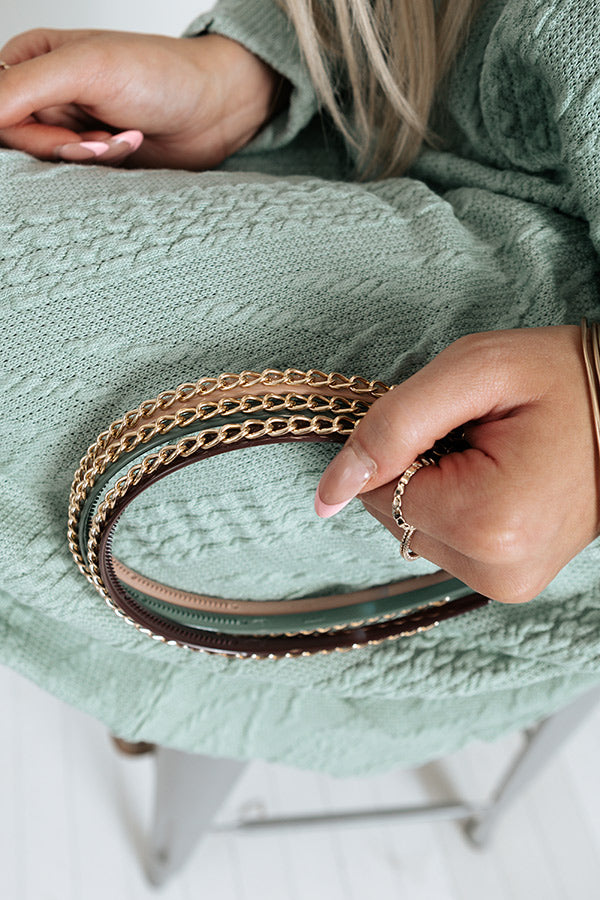 Add a subtle touch of luxury to any look with our high end 'Remix It Headband Set' featuring three pieces with a gold chain detail: a black, sage, and light brown one!