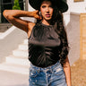 Let you soul run free in our chic black 'Renegade' top featuring lightweight satin material, a rounded neckline with wide sleeveless shoulder straps, a side ruched detail with a tie closure, a keyhole accented upper back, and a flattering silhouette that ends in a straight hemline!