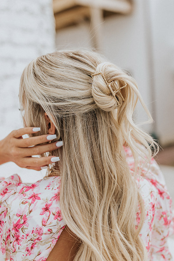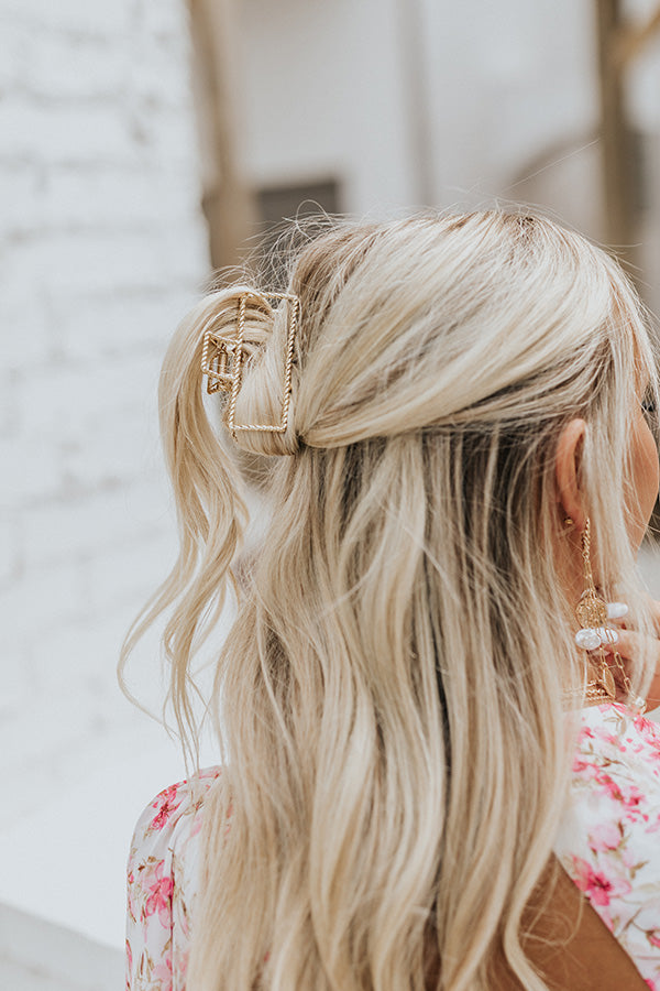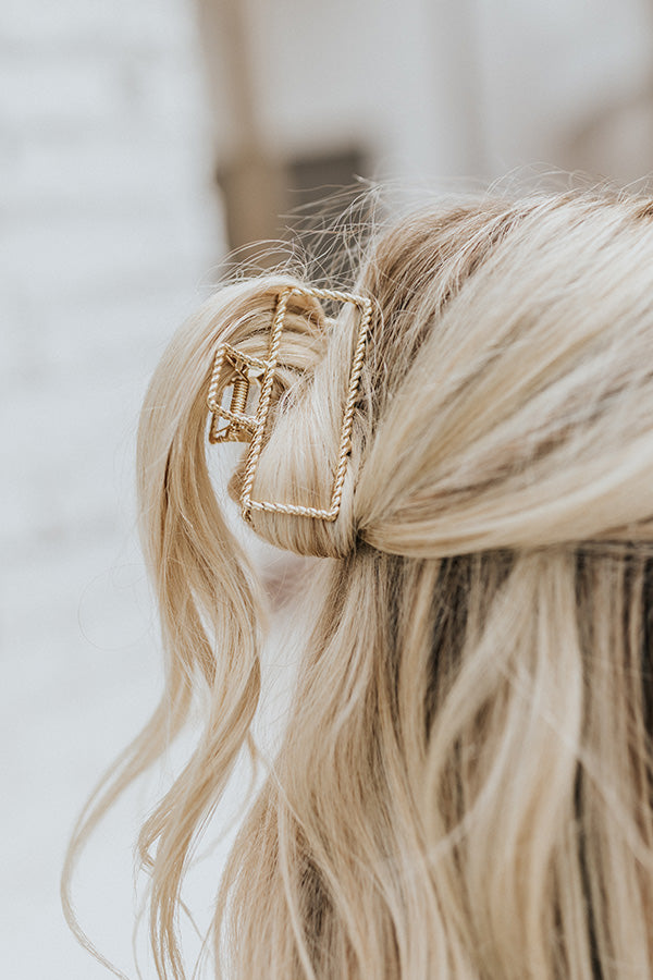 Achieve a luxe hair style with our chic 'Renew My Love Hair Claw Clip' featuring a twisted gold open rectangle silhouette!
