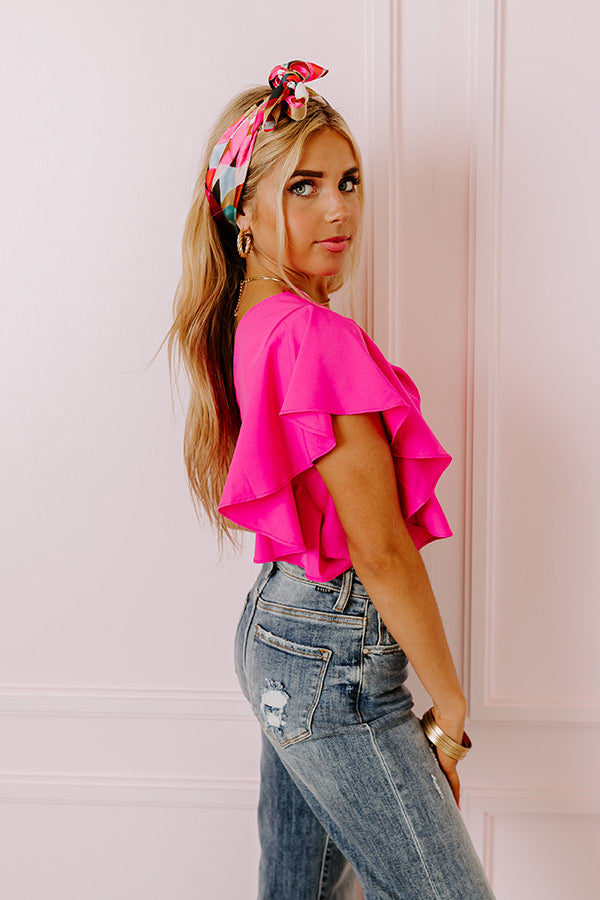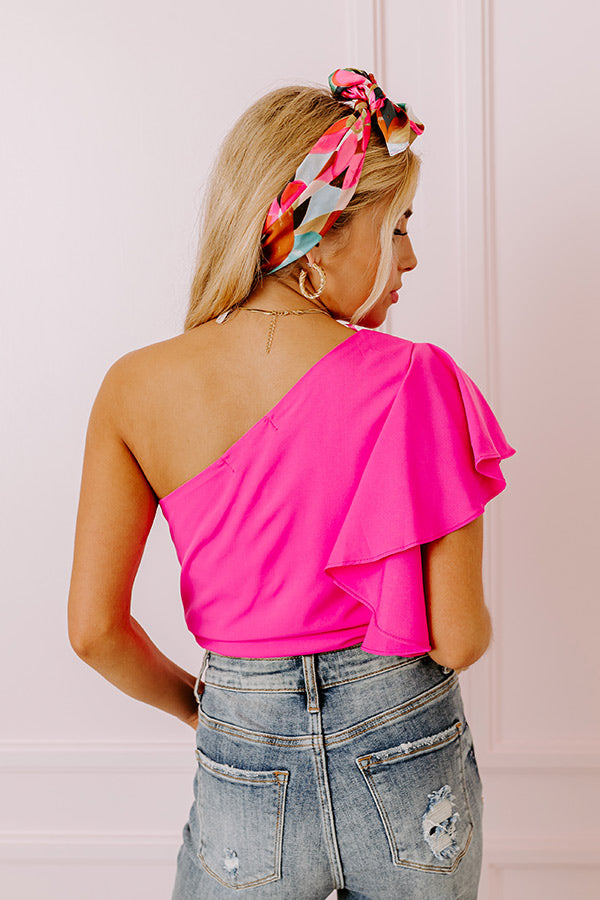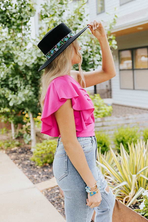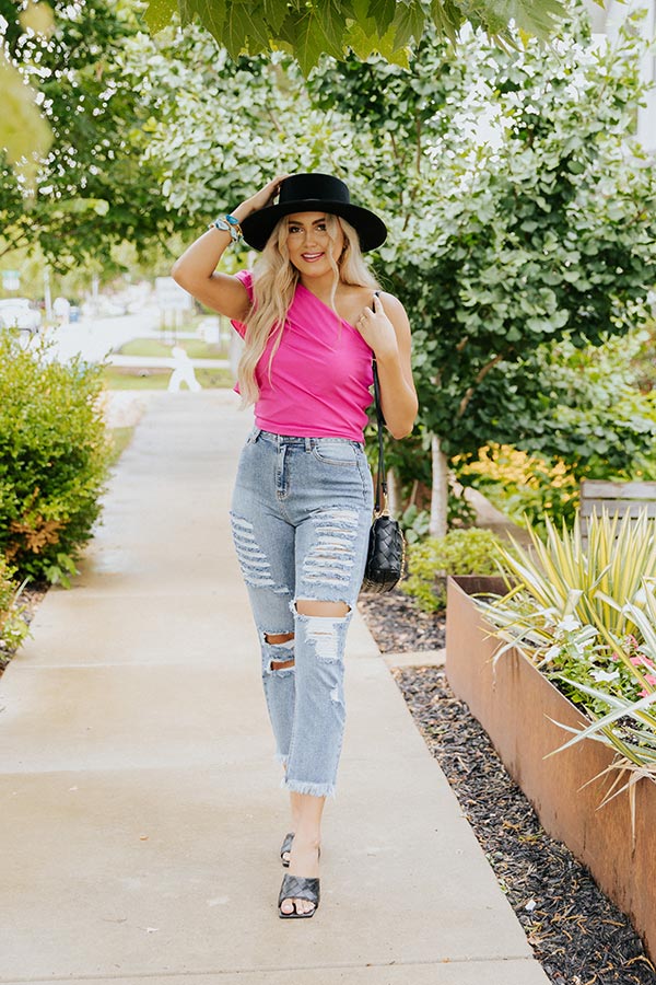 You are sure to love this renowned fuchsia shift top featuring lightweight material, a diagonal neckline and upper back with a flowy half sleeve, and a flattering silhouette that ends in a straight hemline!