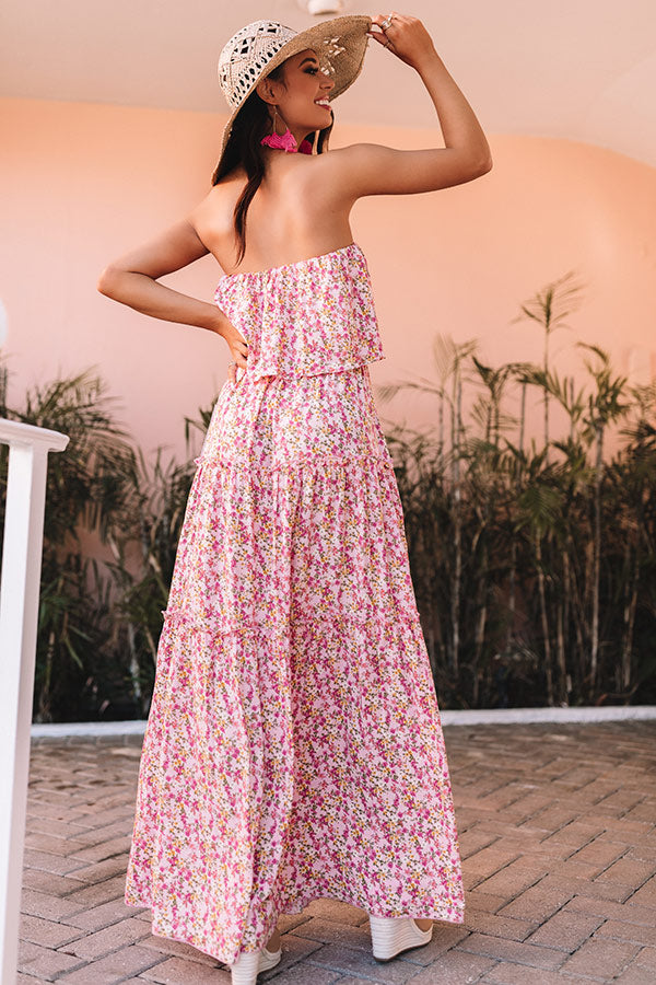 There is no better piece to wear when you are resort bound than this photo worthy maxi dress featuring lightweight flowy material patterned with an intricate pink and yellow floral print, an off shoulder fit with a straight elastic neckline, an overlaid bodice, a cinched waistline with a tie belt closure, and an ultra relaxed silhouette that cascades into a straight floor-length hemline with a thigh-high accent slit! Measurements