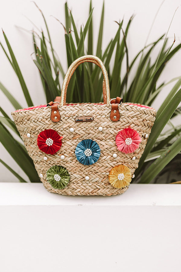 Tan woven tote with colorful floral & pearl accents, featuring:
