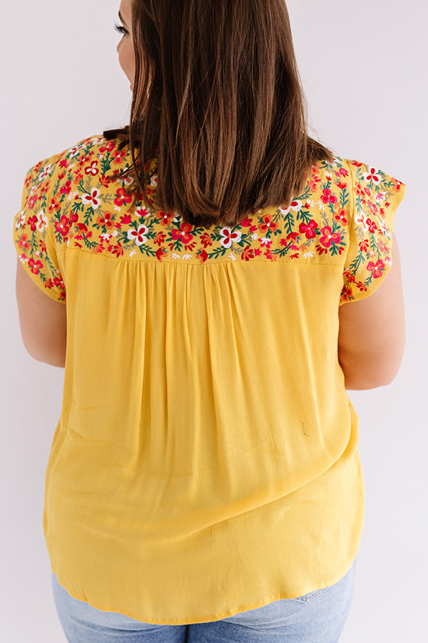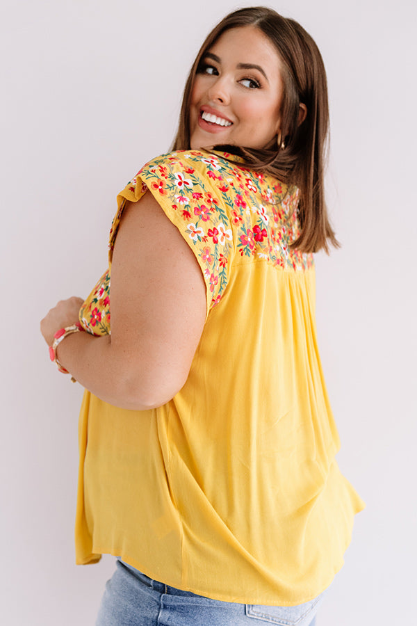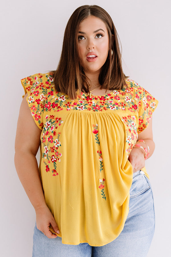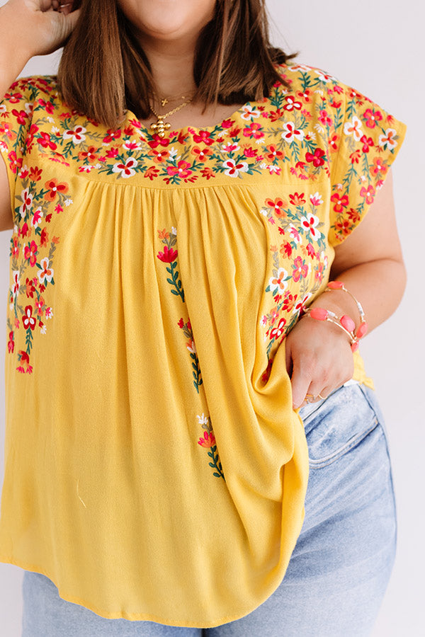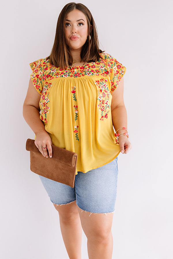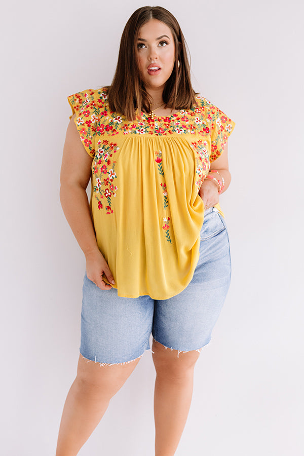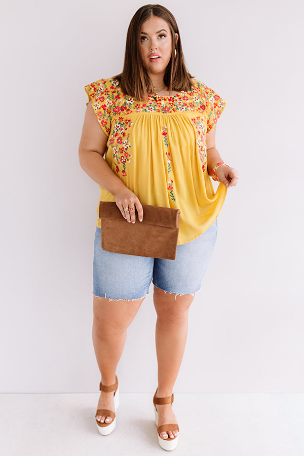 Plus Size - Our adorable marigold colored "Resort To This" shift top has us dreaming of spring with its intricate red, orange, and green hued embroidered floral pattern, lightweight material, high rounded neckline, short semi-flared sleeves, and relaxed silhouette that falls into a rounded hemline! We have styled this blossoming piece with some light wash shorts and a brown block heel and clutch, but you can also wear it with some distressed white flares, "The Chandler Heel in Orange," and our "Sunny Situation Straw Hat!"