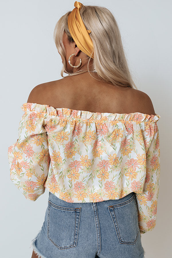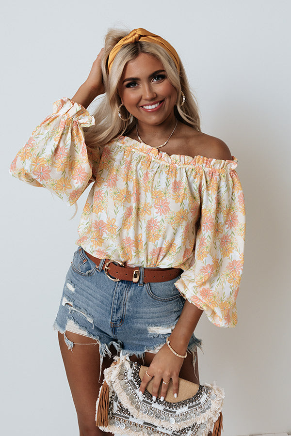 You are sure to channel all the resort vibes when you complete your look with this adorable top featuring lightweight flowy material patterned with a light orange and pink floral print, a straight elastic off shoulder neckline with ruffled trim detailing, oversized long drop sleeves with ruffled cuffs, and a slouched silhouette that falls into a straight hemline! Measurements
