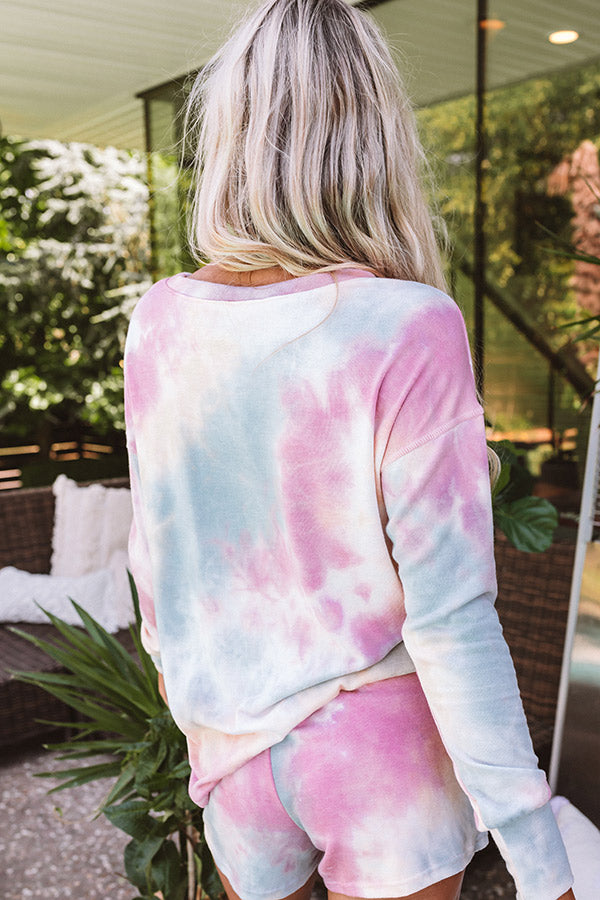 "Reset and relax" in style with this adorable top featuring ultra soft lightweight material patterned with blush, orange, and blue hued tie dye, a wide rounded neckline that can be worn off one shoulder, long loose sleeves with fitted cuffs, and a relaxed silhouette that falls into a rounded hemline that can be knotted! This comfy piece styles perfectly with our matching "Rest And Relax Tie Dye Shorts in Blush," sunnies, and some fuzzy slippers for the ultimate two-piece lounge look!