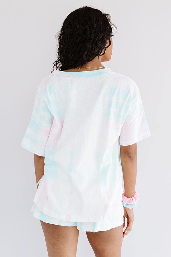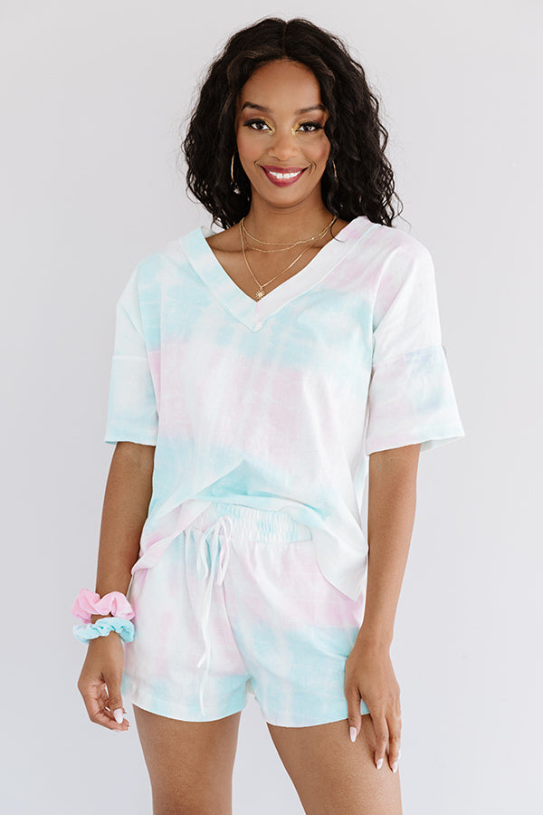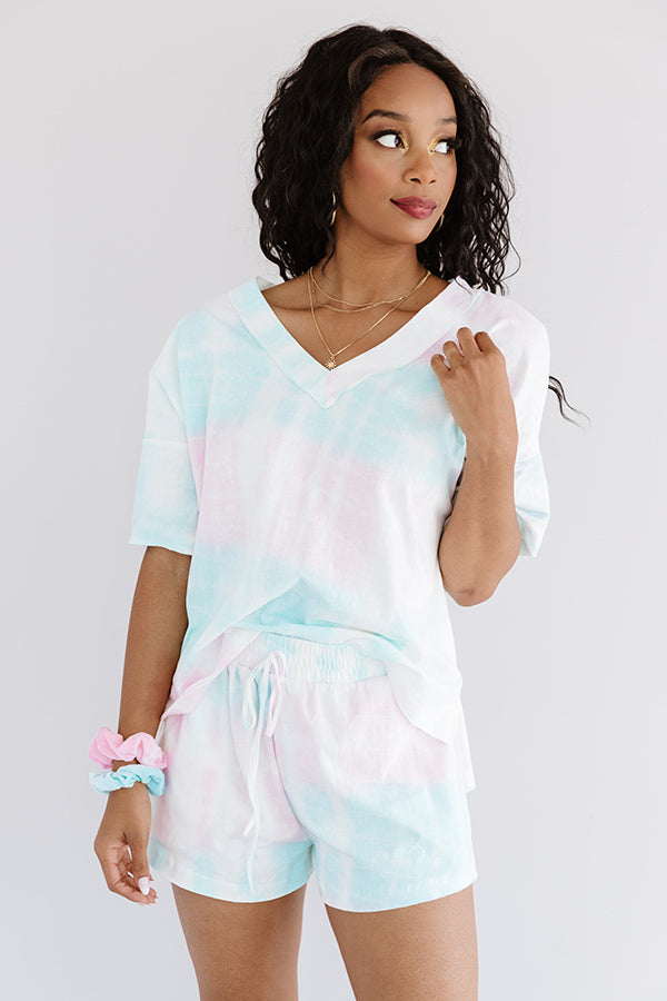 "Reset and relax" in style with this adorable shift tee featuring ultra soft lightweight material patterned with pink and blue hued tie dye, a v-cut neckline, short loose sleeves, and a relaxed silhouette that falls into a straight hemline! This comfy piece styles perfectly with our matching "Rest And Relaxation Tie Dye Shorts in Pink," a scrunchie, and some fuzzy slippers for the ultimate two-piece lounge look!