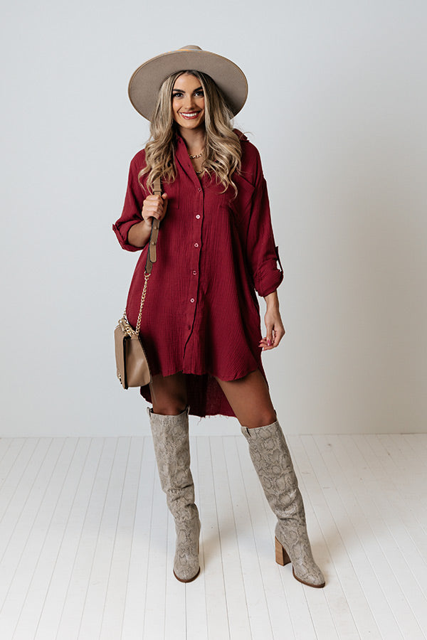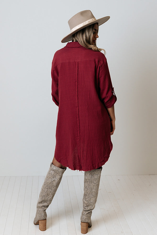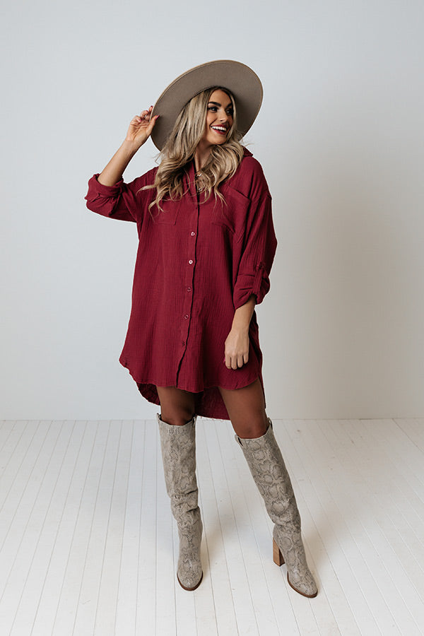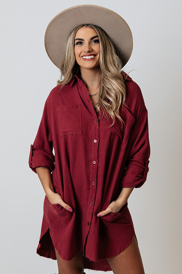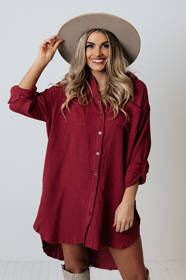 The perfect transitional piece just dropped! Our casual cute crimson colored 'Retreat For Two Shift Dress' features lightweight linen-like material, a button down front with a collared neckline, long loose sleeves with roll tab cuffs, two chest pockets and two low pockets, and an ultra relaxed silhouette that falls into a rounded mid-thigh length hemline!