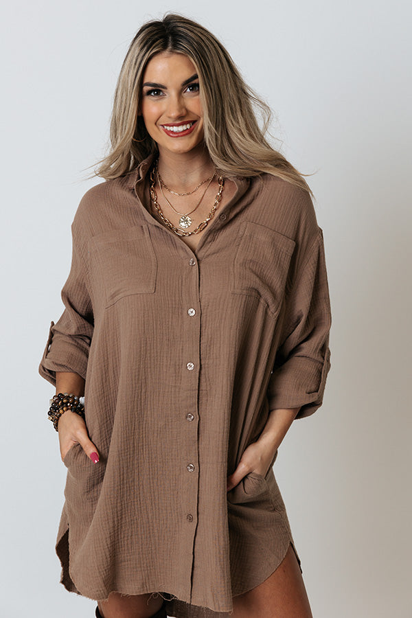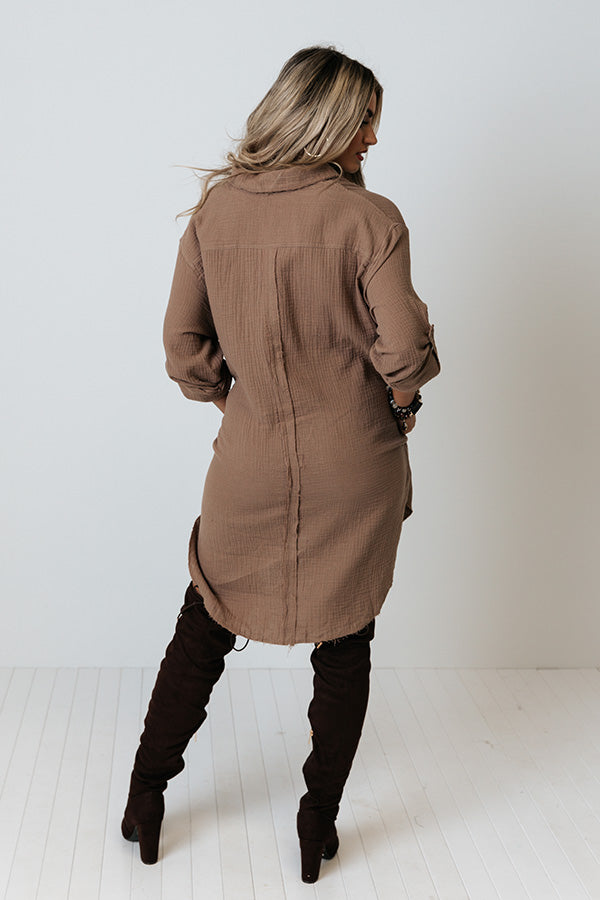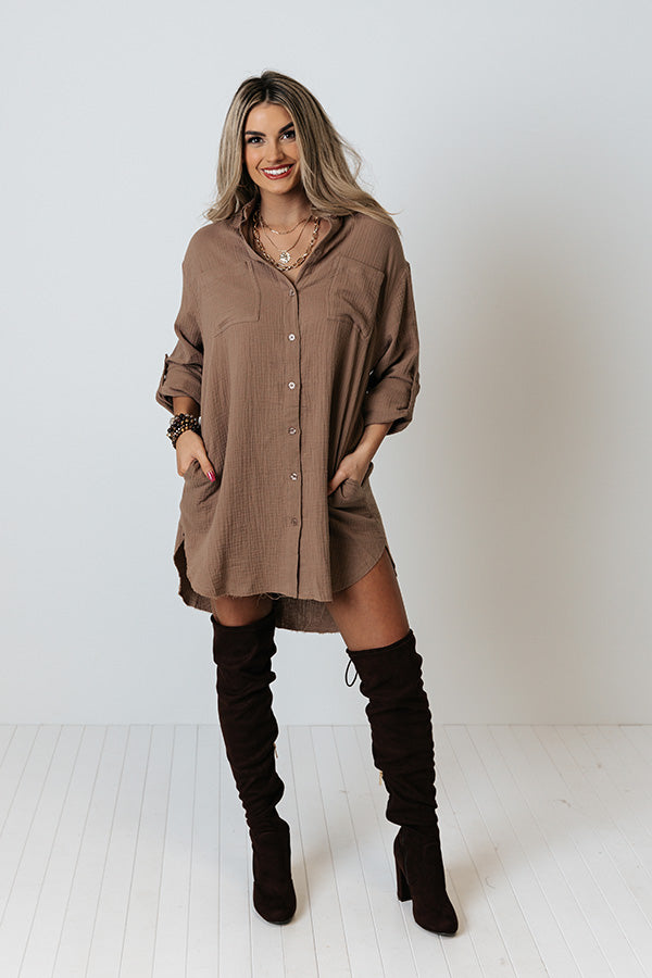The perfect transitional piece just dropped! Our casual cute mocha colored 'Retreat For Two Shift Dress' features lightweight linen-like material, a button down front with a collared neckline, long loose sleeves with roll tab cuffs, two chest pockets and two low pockets, and an ultra relaxed silhouette that falls into a rounded mid-thigh length hemline! Measurements