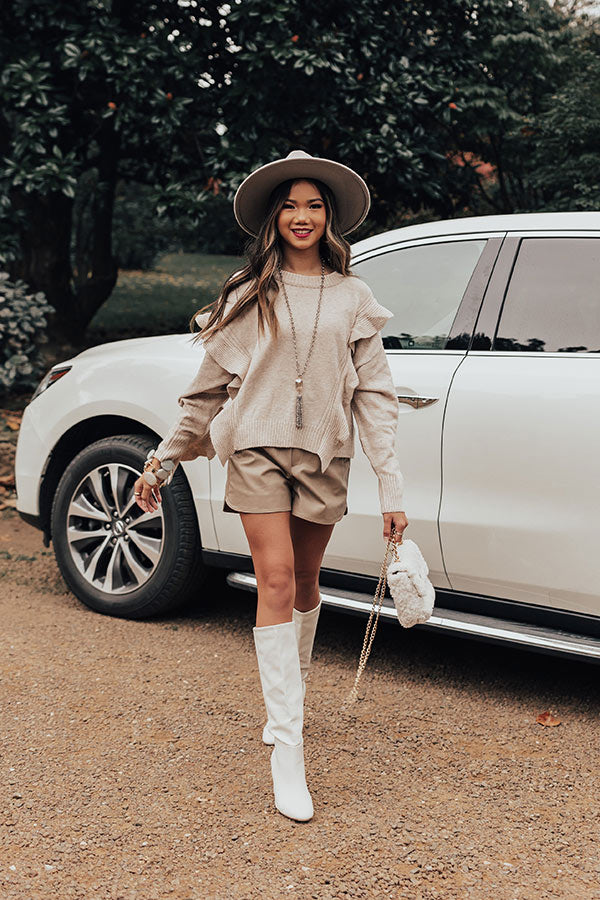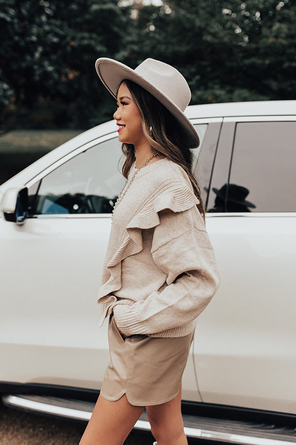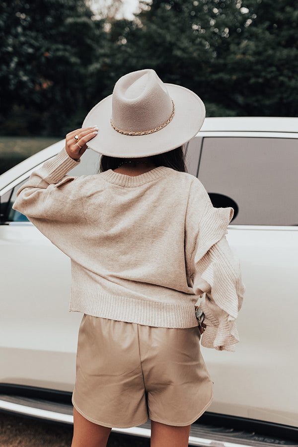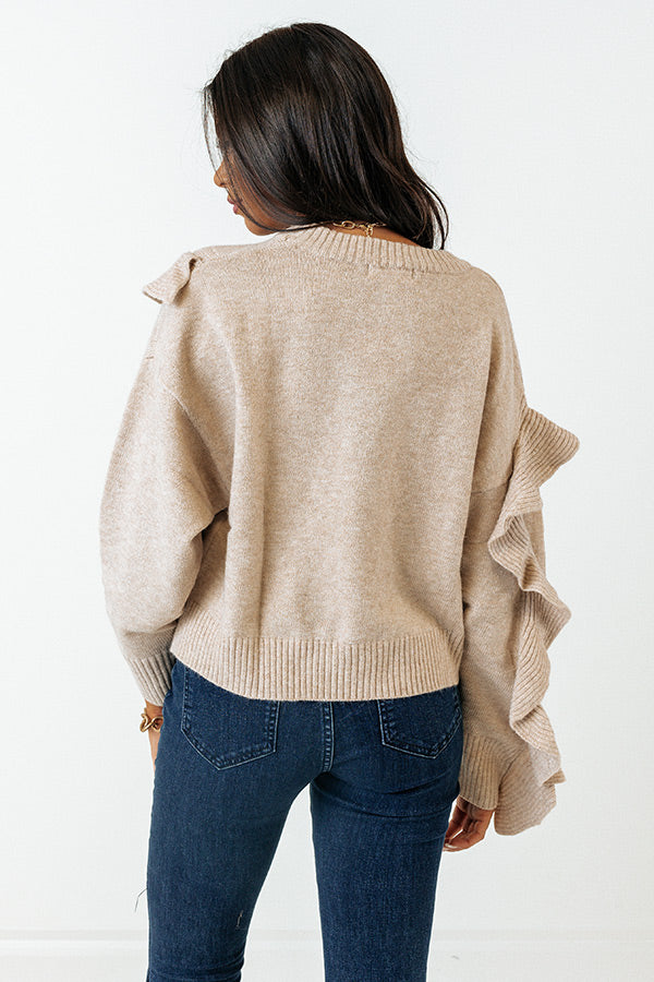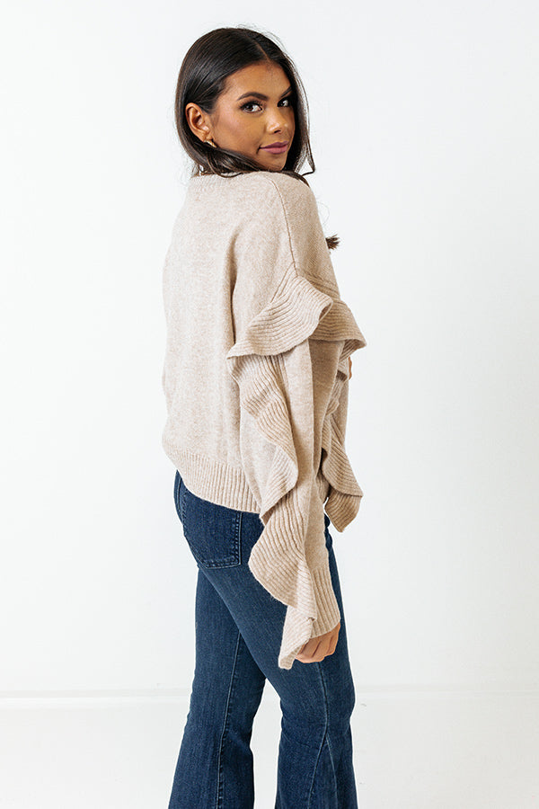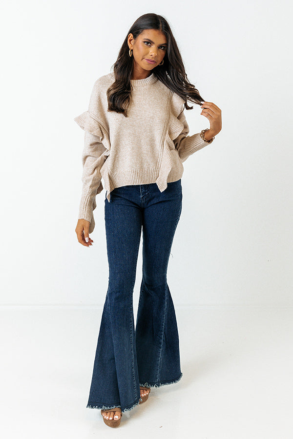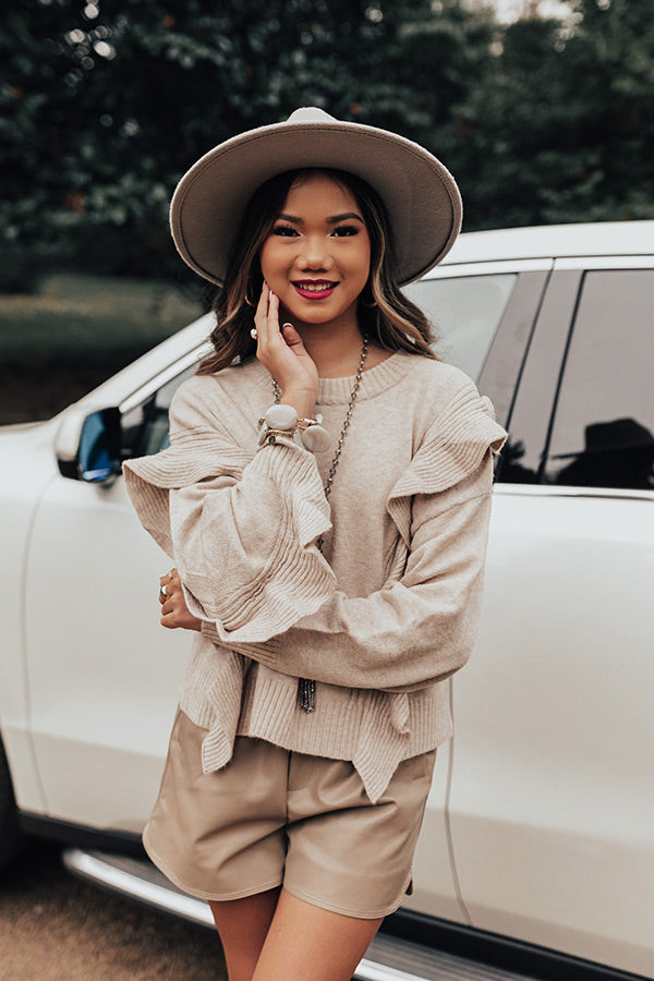 Make a bold statement with our charming birch colored 'Retreat To The Mountains Sweater' featuring soft knit material, a rounded neckline, long loose sleeves with ruffled detailing, and a slouched silhouette that falls into a straight hemline!