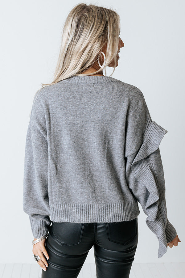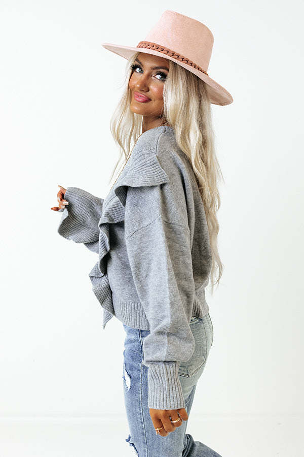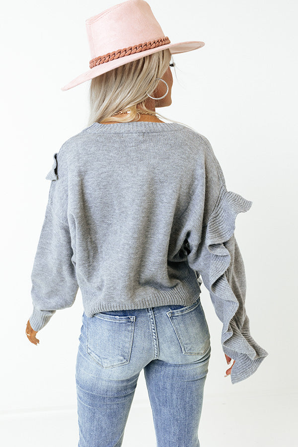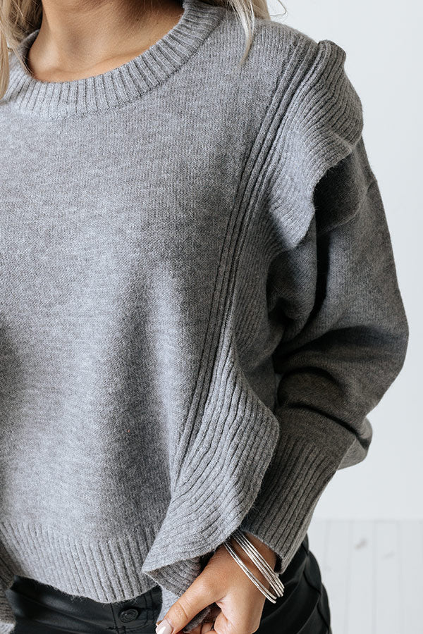 Make a bold statement with our charming grey 'Retreat To The Mountains Sweater' featuring soft knit material, a rounded neckline, long loose sleeves with ruffled detailing, and a slouched silhouette that falls into a straight hemline!