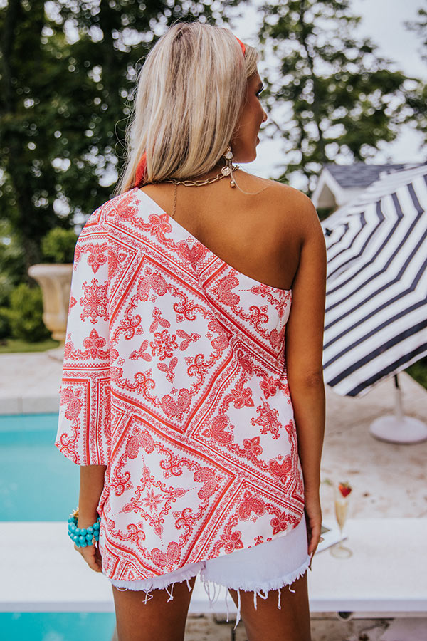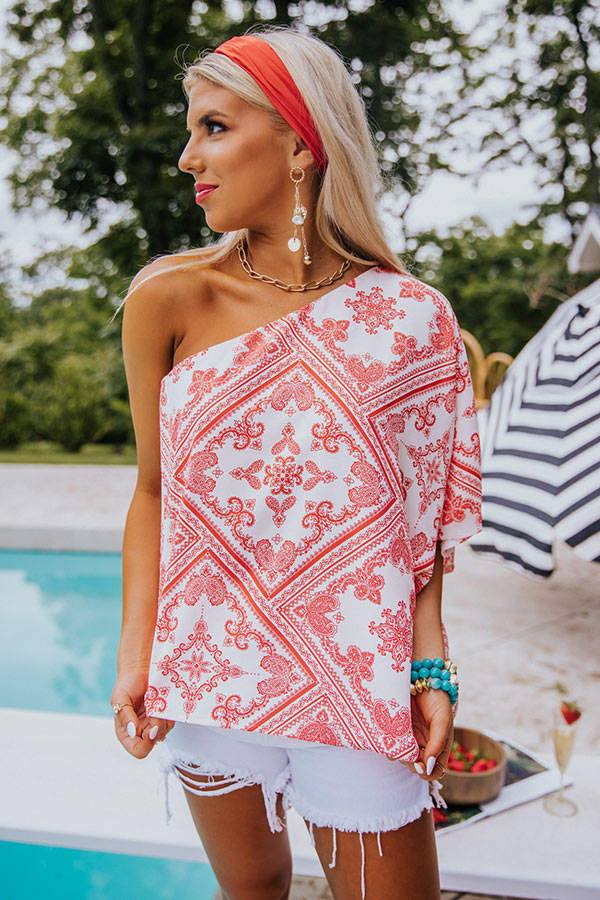 Revolutionize your style with this pretty white top featuring lightweight breezy material patterned with an intricate red paisley print, a diagonal neckline with a single short sleeve, and a slouched silhouette that falls into a straight hemline! Measurements