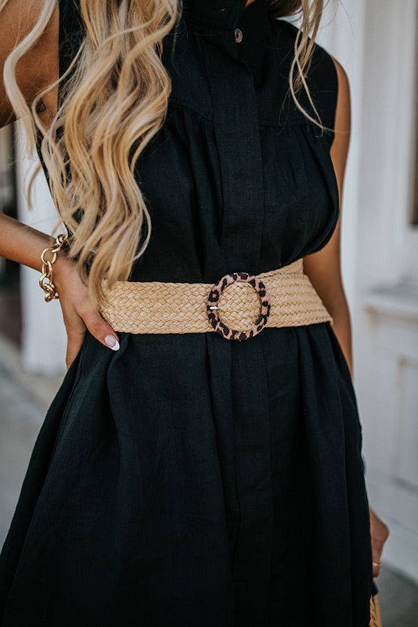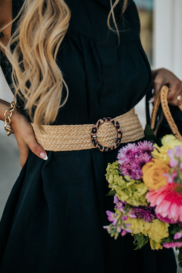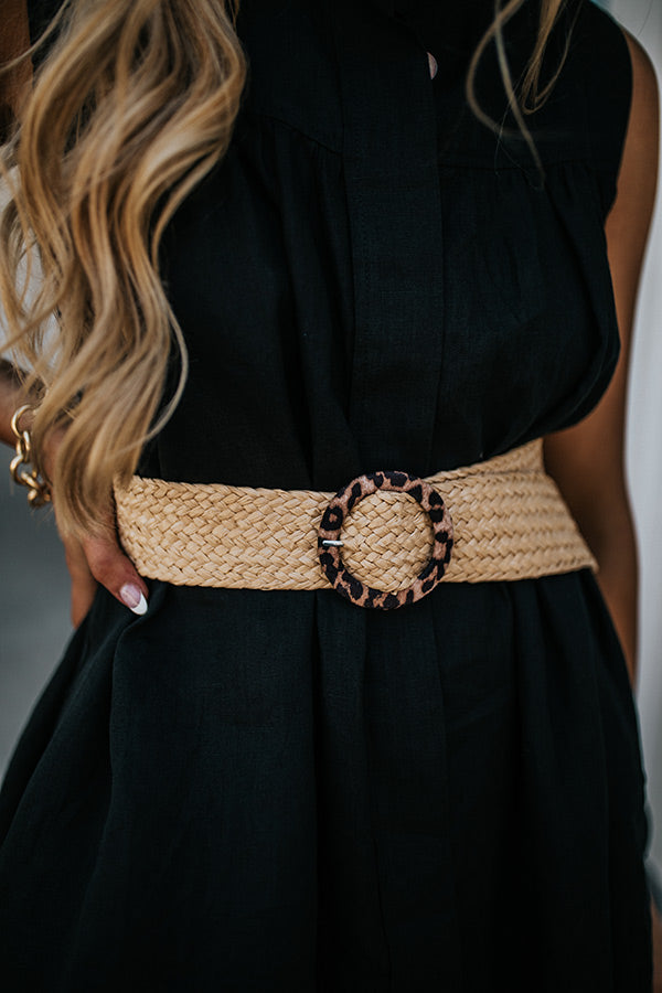 Take your accessories for a walk on the wild side with our flirty 'Rhode Island' belt featuring a wide woven strap with a leopard print hoop buckle!