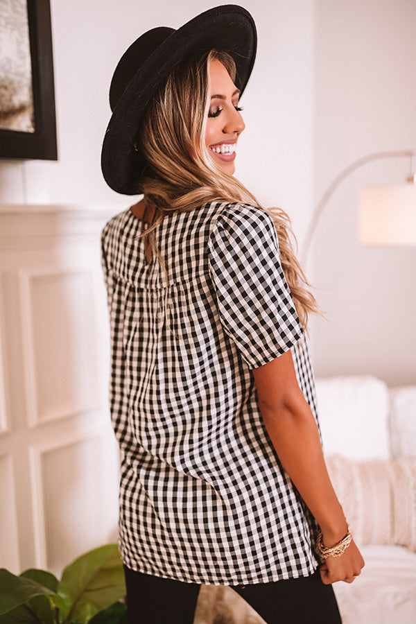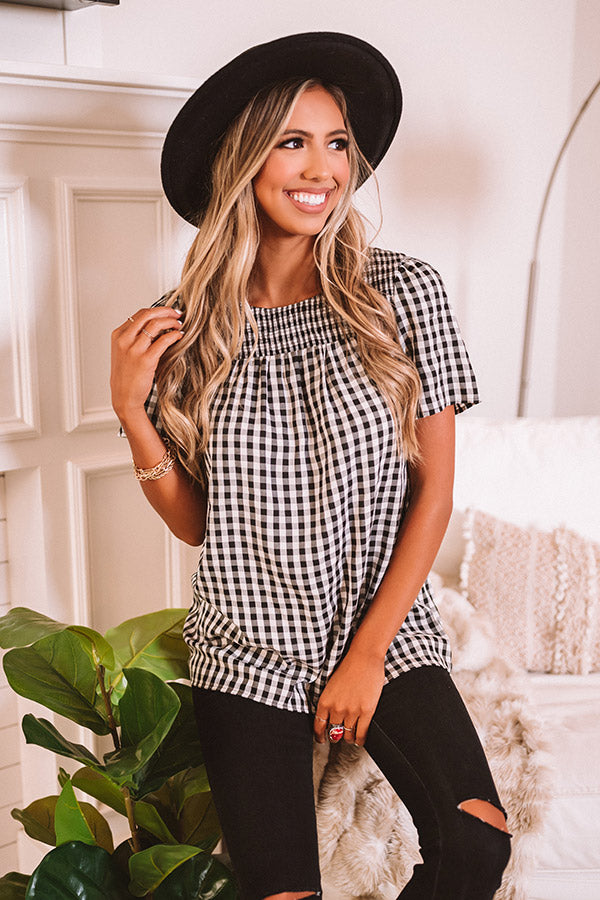 Up our style game in our adorable "Rich In Love Shift Top" featuring lightweight material patterned with a black and white checkered pattern, a high rounded neckline, short loose sleeves, a keyhole accented upper back with a button closure, and a relaxed silhouette that falls into a straight hemline! This cutie pairs perfectly with some distressed black flares, a red faux leather quilted tote, and a black bootie and wool hat, but you can also wear it with layered under a jean jacket some frayed white skinnies and our "Go On Faux Suede Heel in Black!" Measurements