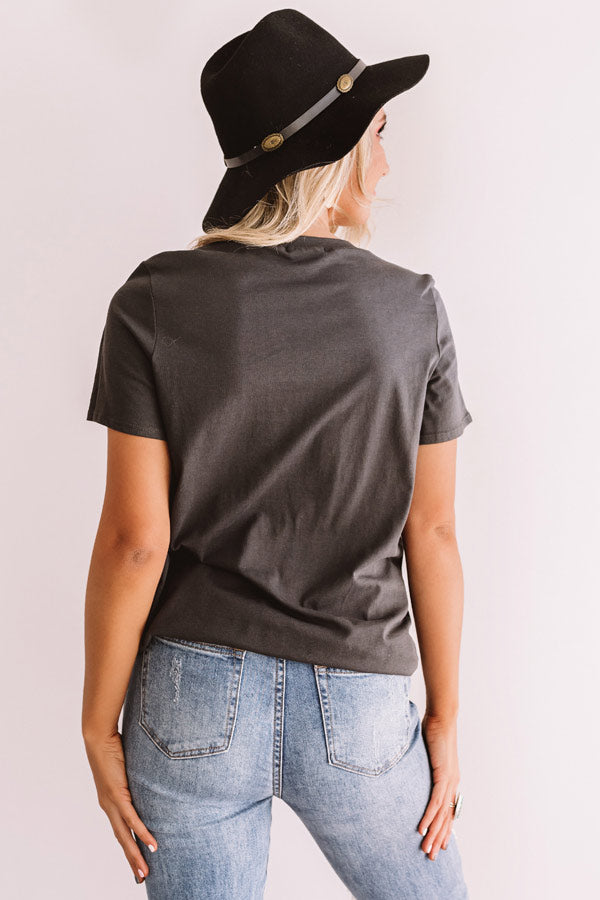 Life is a party, so dress like it in this black graphic "Ride'em Cowboy" boyfriend tee featuring short sleeves, a high rounded neckline, subtle distressing, a split sided straight hemline that looks great front tucked, and a relaxed bodice with a stylish rodeo scene and cute font on the front! We have styled this chic grunge piece with some distressed ankle skinnies and a black bootie, tote, and faux suede hat, but you can also pair this piece with our "Spotted At The Met Wrap Skirt in Cream" and colored accessories like "The Mary Kate Faux Suede Heel in Light Turquoise" and our "Suncatcher Earrings in Yellow!" Measurements