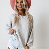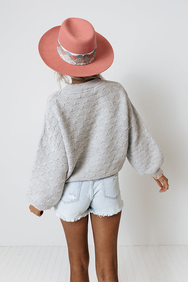 Get cozy but cute in our adorable light grey 'Ridgeway' sweater featuring soft knit material with scalloped knit texturing, a rounded neckline, long bubble sleeves with fitted cuffs, and a slouched silhouette that ends in a straight hemline! Measurements