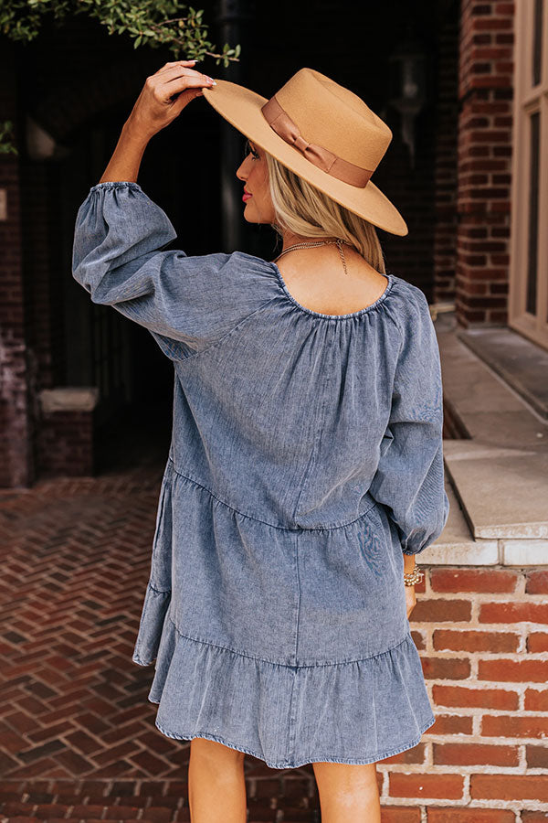 - Perfect for your next brunch date, this darling dress will keep you looking like a trendsetter! - Lightweight, unlined denim material - A v-cut neckline - Long, loose sleeves with elastic cuffs - Hidden side pockets - A flowy tiered skirt silhouette that ends in a mid-thigh length hemline