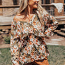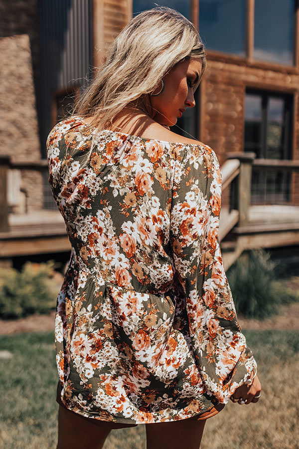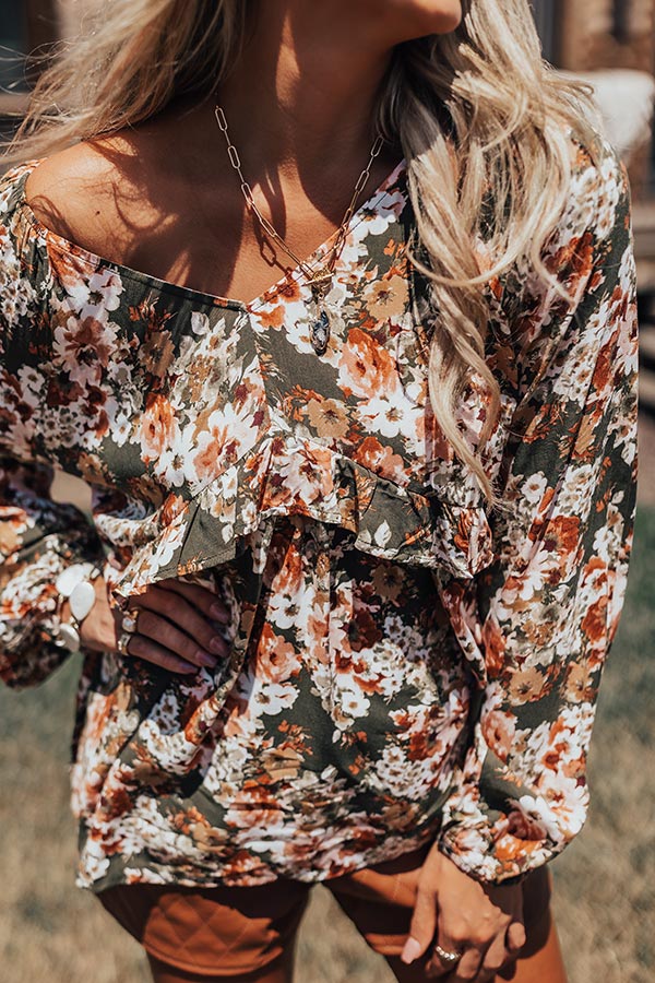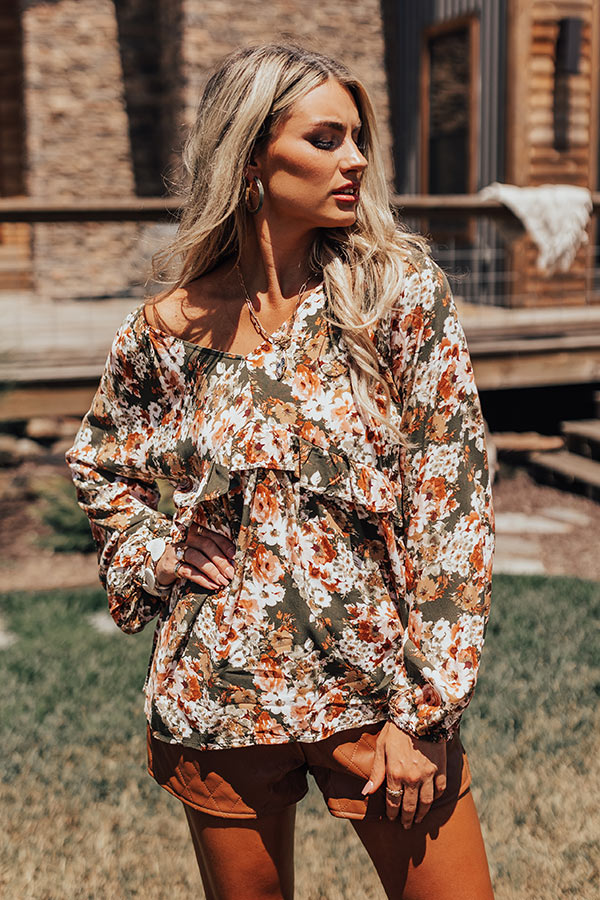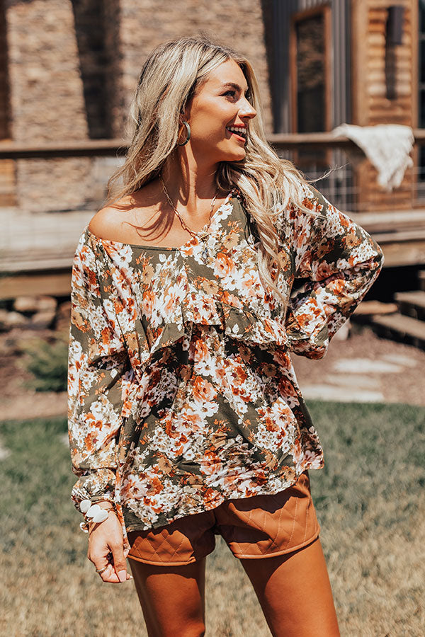 Let your fall style blossom with our gorgeous 'Right Where You Are' top featuring lightweight flowy material patterned with a rust, white, olive, and light natural hued floral print, a v-cut neckline with ruffle detailing around the bodice, long bubble sleeves, and a relaxed babydoll silhouette that falls into a straight hemline!