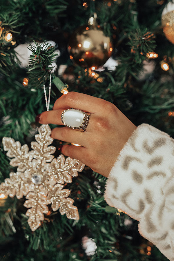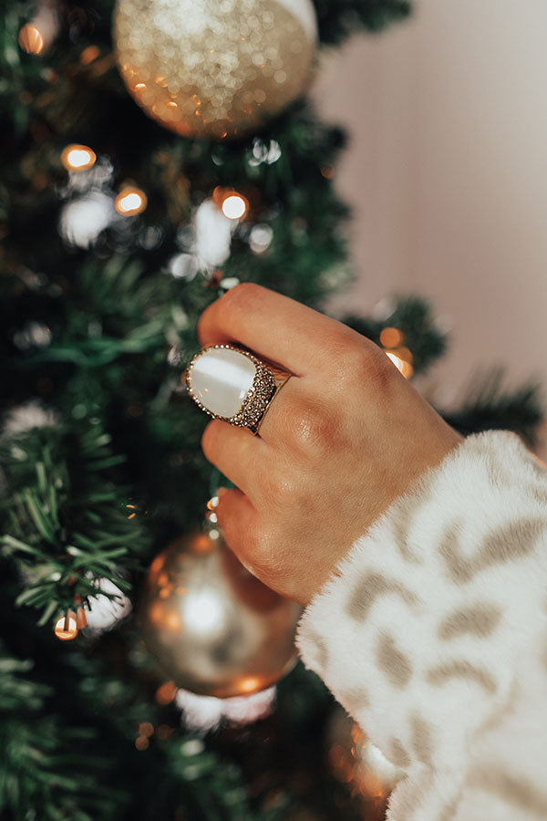 Make a bold statement with this stunning ring featuring a large oval opal hued faux stone surrounded by rhinestones and set inside a wide textured band!