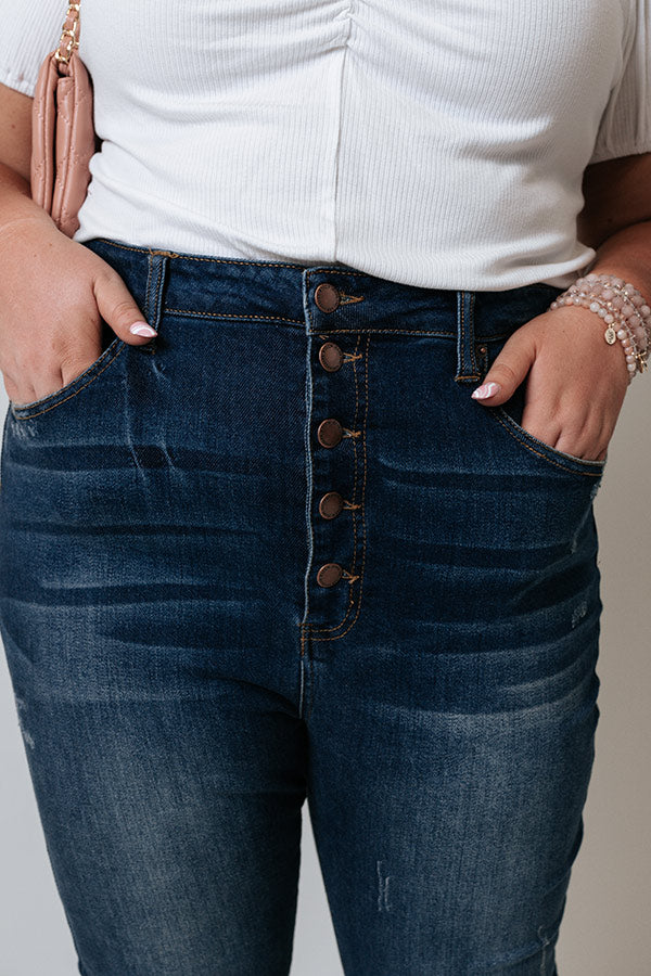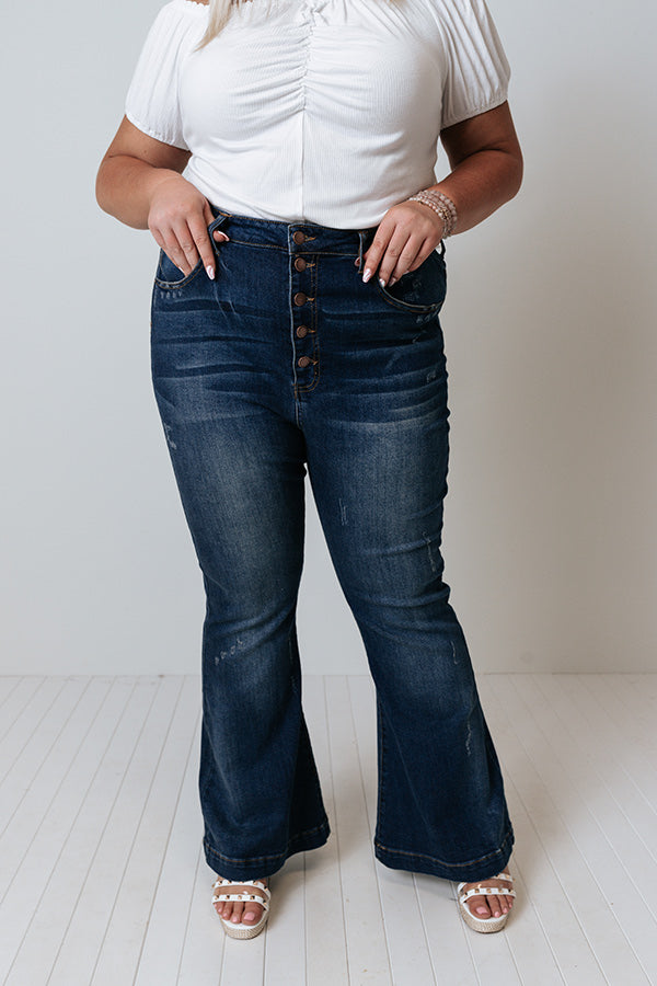Plus Size - Stay groovy in our trendy 'Apollo' flares featuring lightweight dark wash denim material with accent fading, a high waistline with belt loops, a classic five pocket cut, a five button closure, and a flattering figure hugging silhouette that ends in flared ankle-length hemlines! Measurements