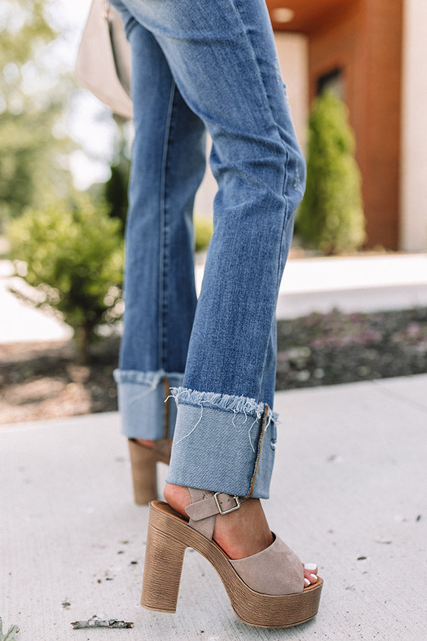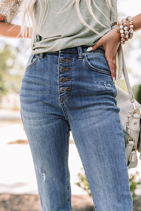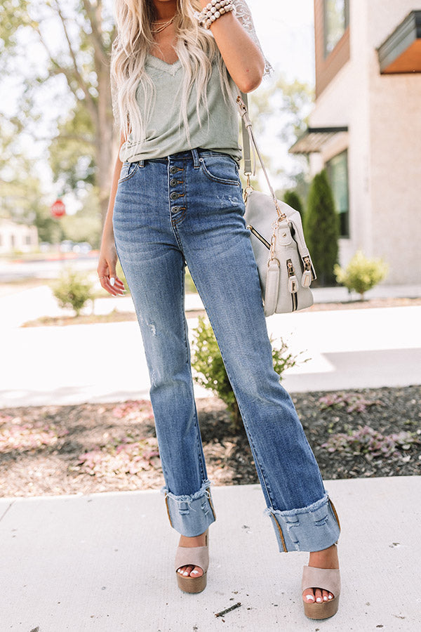 Upgrade your denim wardrobe with our adorable 'Kelsea' pants featuring lightweight medium wash material with accent fading and subtle distressed detailing, a high waistline with belt loops, a classic four pocket cut, a five button closure, and a relaxed silhouette that falls straight into ankle-length hemlines with oversized frayed trim cuffs! Measurements