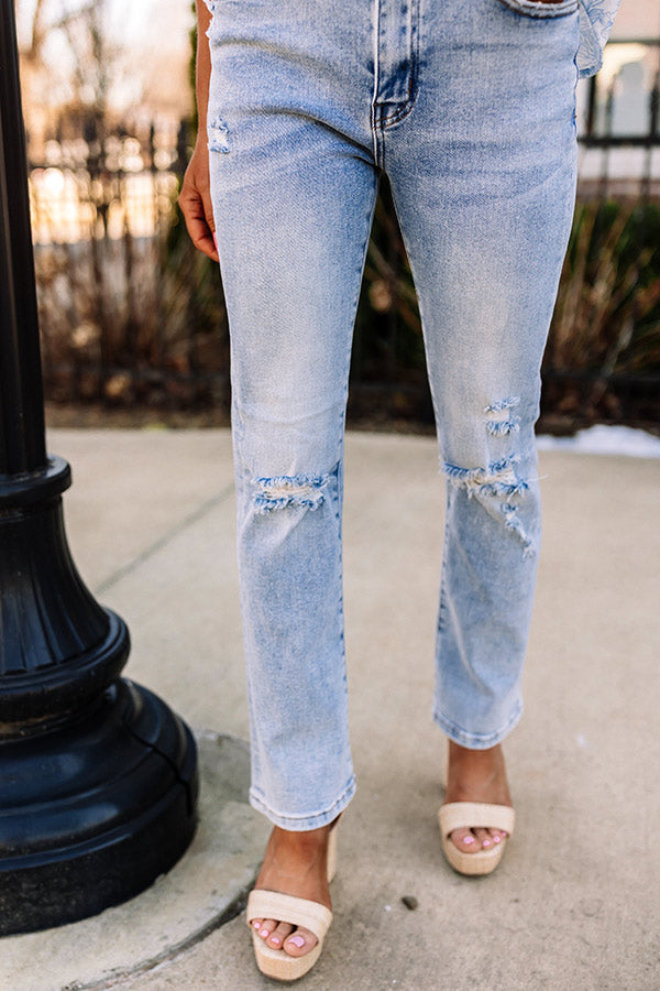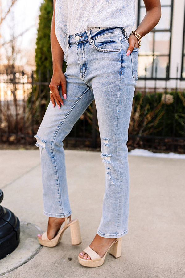 Step up your denim game with our trendy 'Lona' jean featuring lightweight light wash material with accent fading and distressed detailing, a midrise waistline with belt loops, a hidden zip fly with a button closure, a classic four-pocket cut, and a relaxed silhouette that ends in a straight ankle-length hemline!