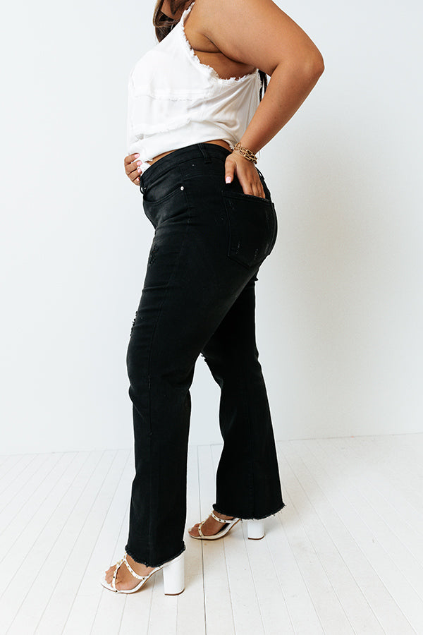 Channel your inner vintage girl with our cute plus size 'Mckenna' jean featuring lightweight black denim material with subtle distressed accents and accent fading, a midrise waistline with belt loops, a hidden zip fly with a button closure, a classic four pocket cut, and a flattering silhouette that ends in flared ankle-length hemlines with frayed trim detailing!