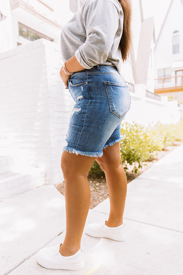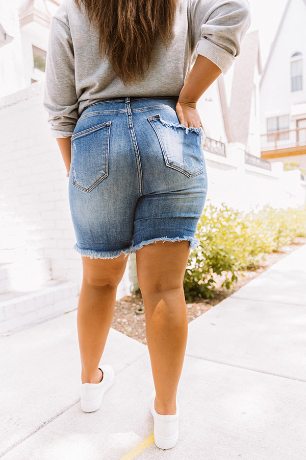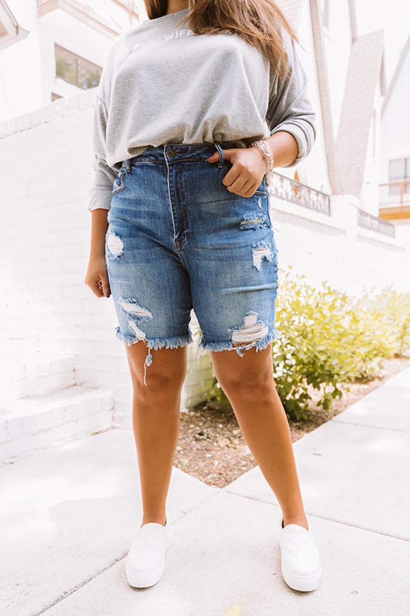 Plus Size - The adorable 'Sonya' shorts feature lightweight medium wash denim material with subtle accent fading and distressed detailing, a high waistline with belt loops, a hidden zip fly with a button closure, a classic four pocket cut, and a relaxed but flattering silhouette that falls into frayed mid-thigh length hemlines!