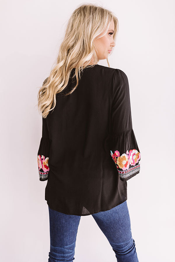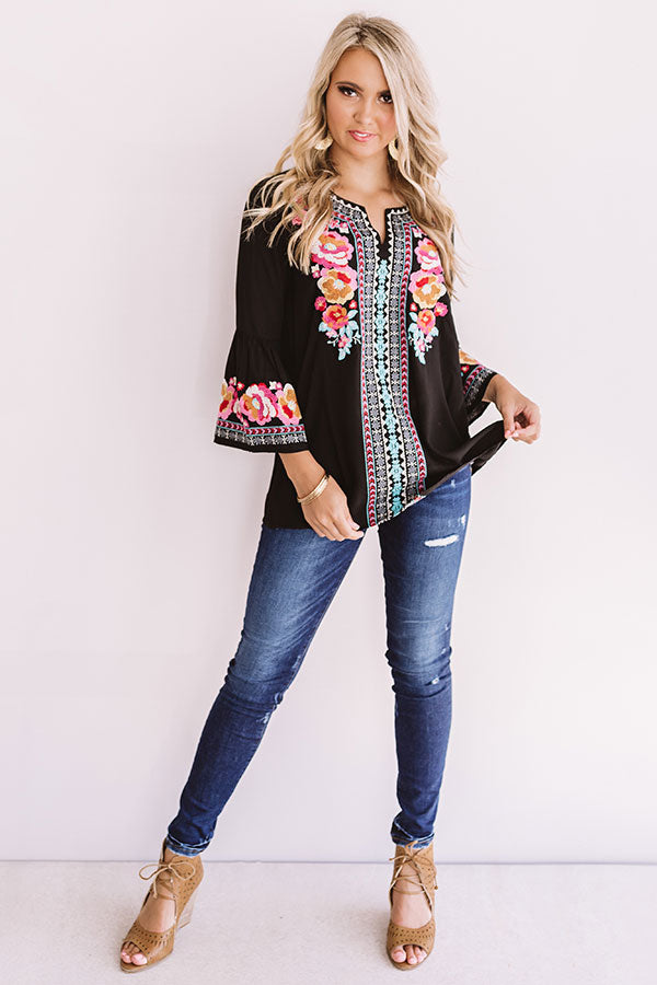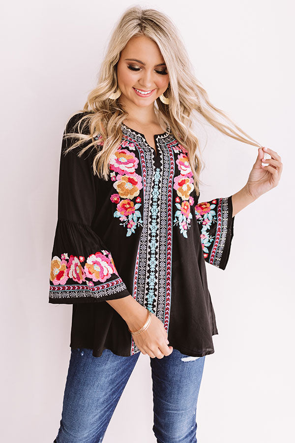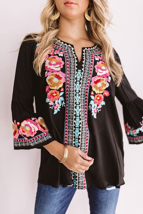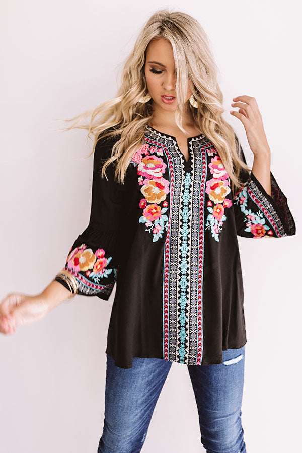 The detailing and bright colors of this intricate black top are sure to make you stand out in a crowd! If features embroidered pink, orange, and blue flowers down the front and at the end of the 3/4 length bell bottom sleeves, and has a notched v-neck with a straight fitting silhouette! You can style this piece with distressed ankle skinnies, neutral cutout wedges, and dainty gold jewelry, or with our "Fashion Week Flare Pants in White" and our "Mia Faux Suede Lace Up Heel in Hot Pink!" Then you just have to grab your best swimsuit and straw tote and you will be on the "road to paradise!"