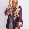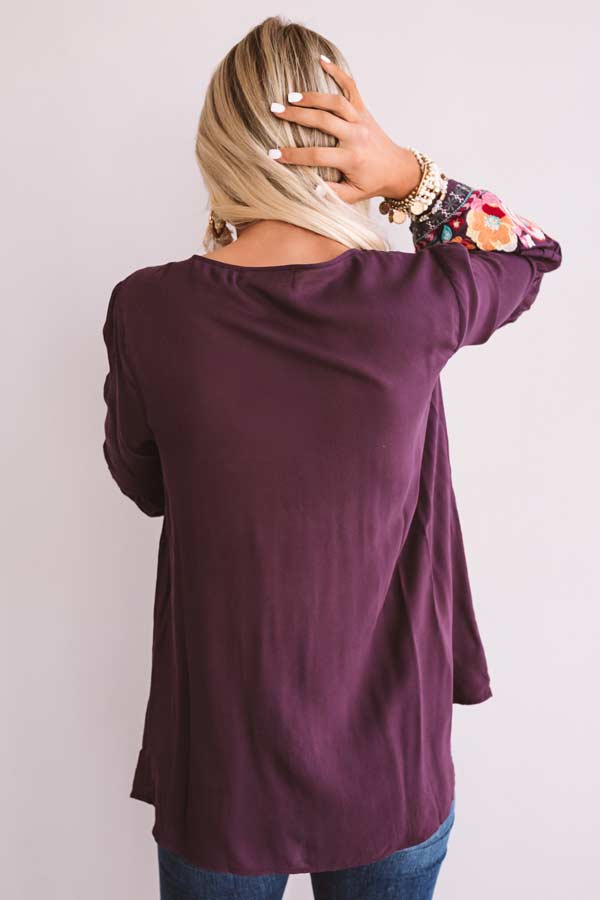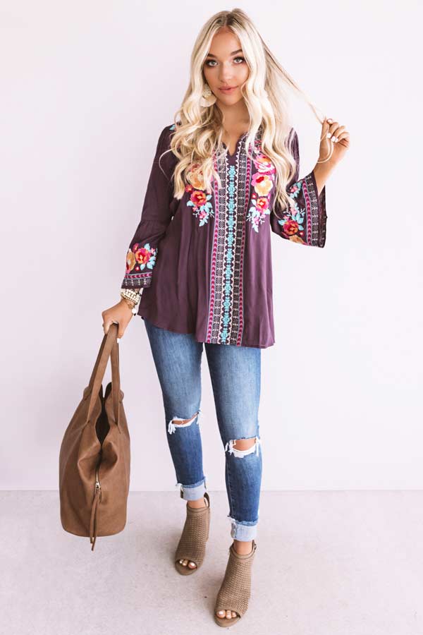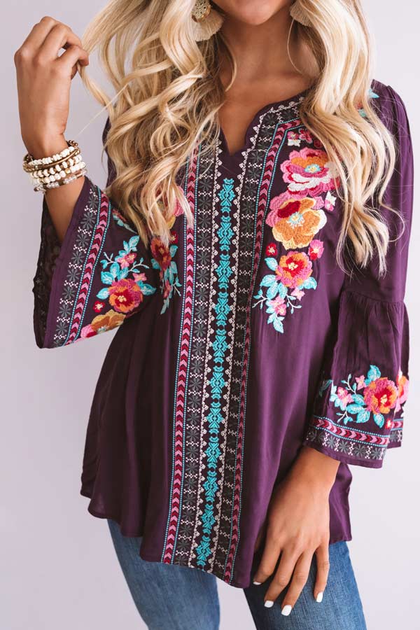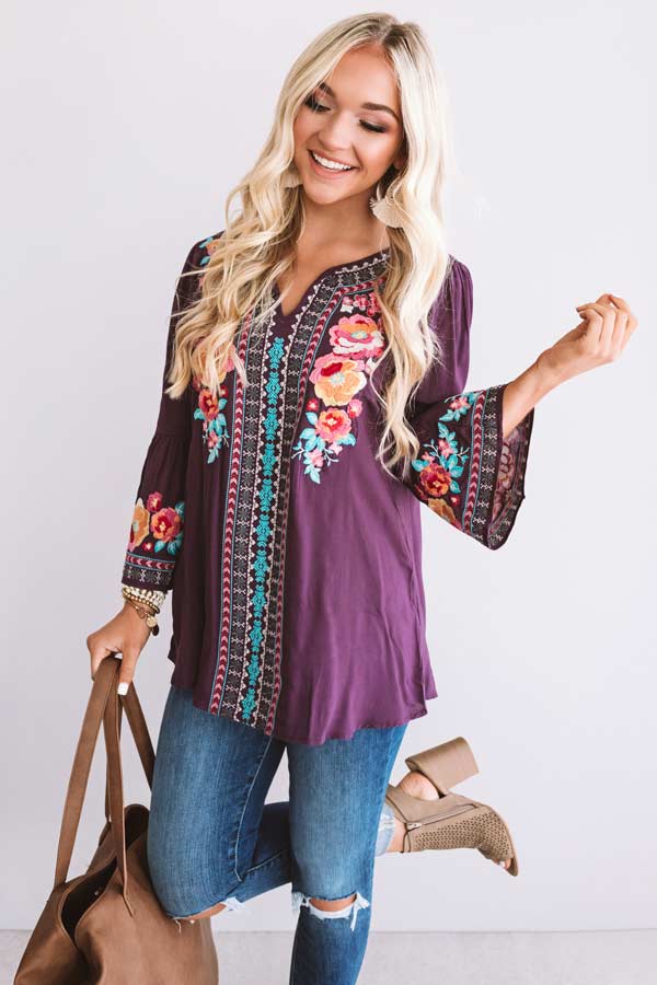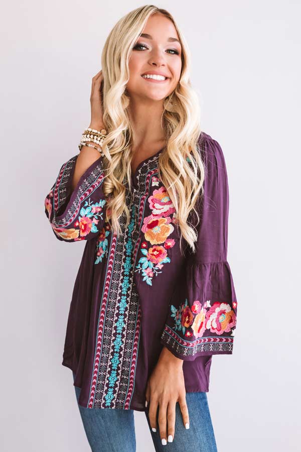 The detailing and bright colors of this intricate purple top are sure to make you stand out in a crowd! If features embroidered pink, orange, and blue flowers down the front and at the end of the 3/4 length bell bottom sleeves, and has a notched v-neck with a straight fitting silhouette! We have styled this piece with some distressed ankle skinnies and a neutral peep toe heel and tote, but you can also wear this with some black flares, our "Say It Ain't Soho Hat in Marigold," and "The Mary Kate Faux Suede Heel in Light Turquoise!" Measurements