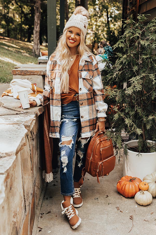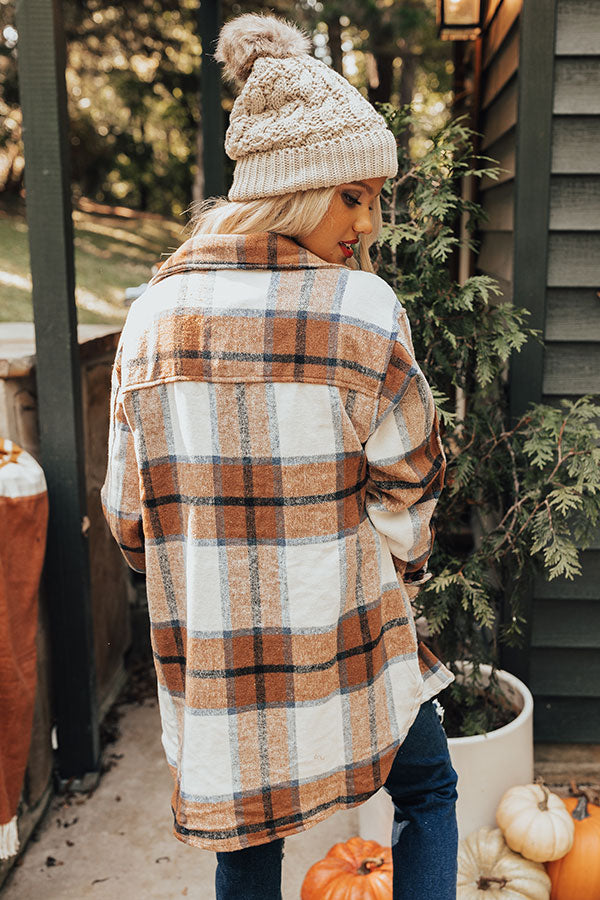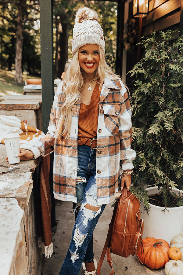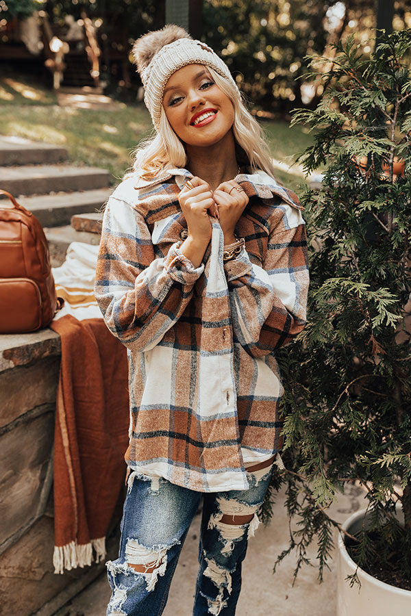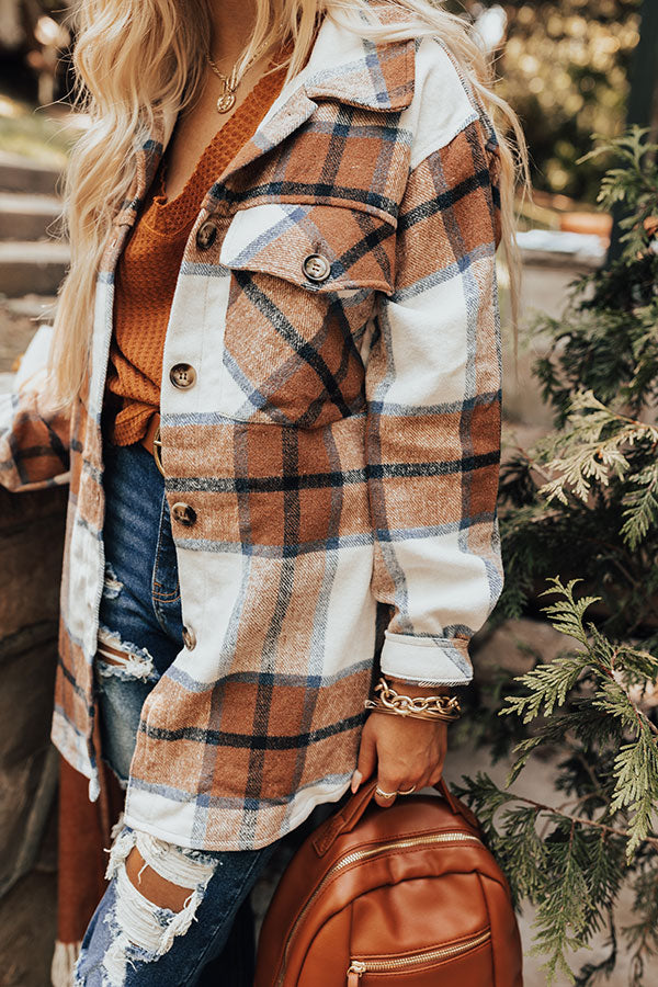 Road trip in style with this gorgeous jacket featuring a large brown and navy plaid print, a button down front with a collared neckline, long loose sleeves with button closure cuffs, two accent chest pockets with flap closures, and a relaxed silhouette that falls into a rounded mid-thigh length hemline! Measurements