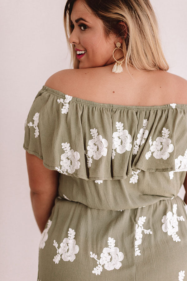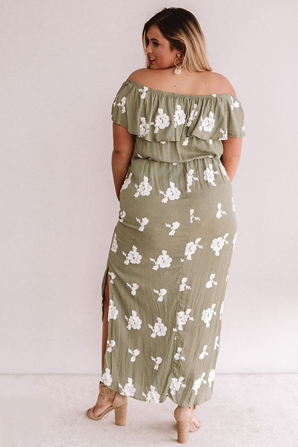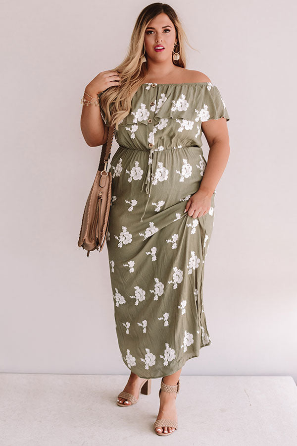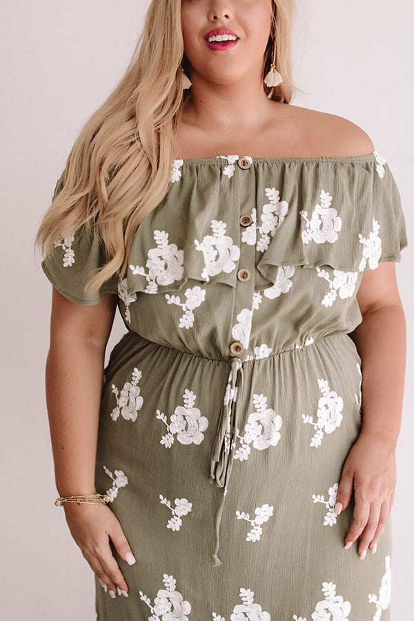 Plus Size - Don't forget this green maxi on all your summer travels with its embroidered flower pattern, off-shoulder neckline, button up bodice, short sleeve overlay, elastic waistline with a tie belt, and flowy skirt with a thigh high slit! This earthy piece can be styled with a nude heel and crossbody or with "The Becca Espadrille in White" and our "Sunrise Beach Walk Hat in White" for the perfect road trip look! Measurements