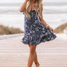 This feminine floral dress has thin adjustable straps, a ruffle trimmed keyhole neckline that ties & a fitted upper bodice that falls into a flirty mini skirt with a flounced bottom hem.
