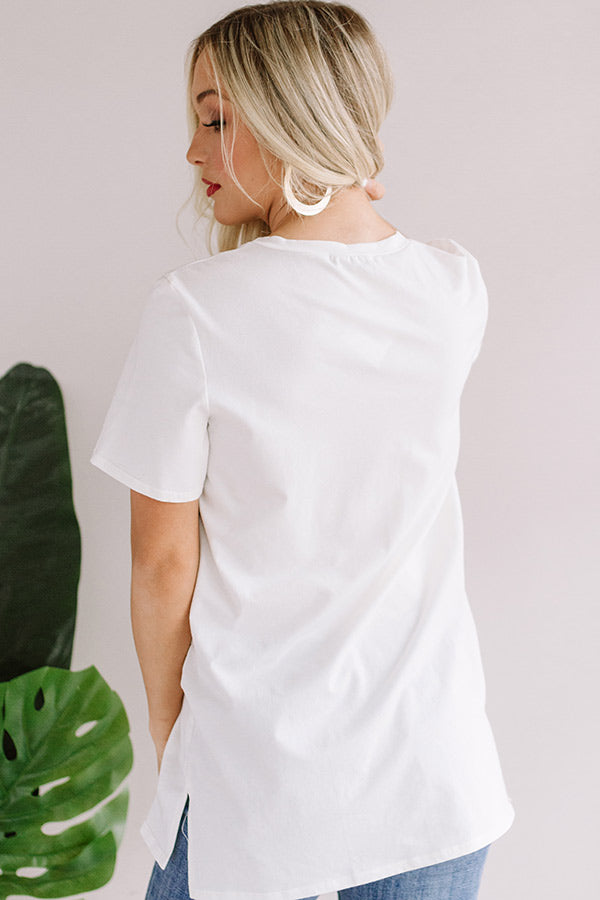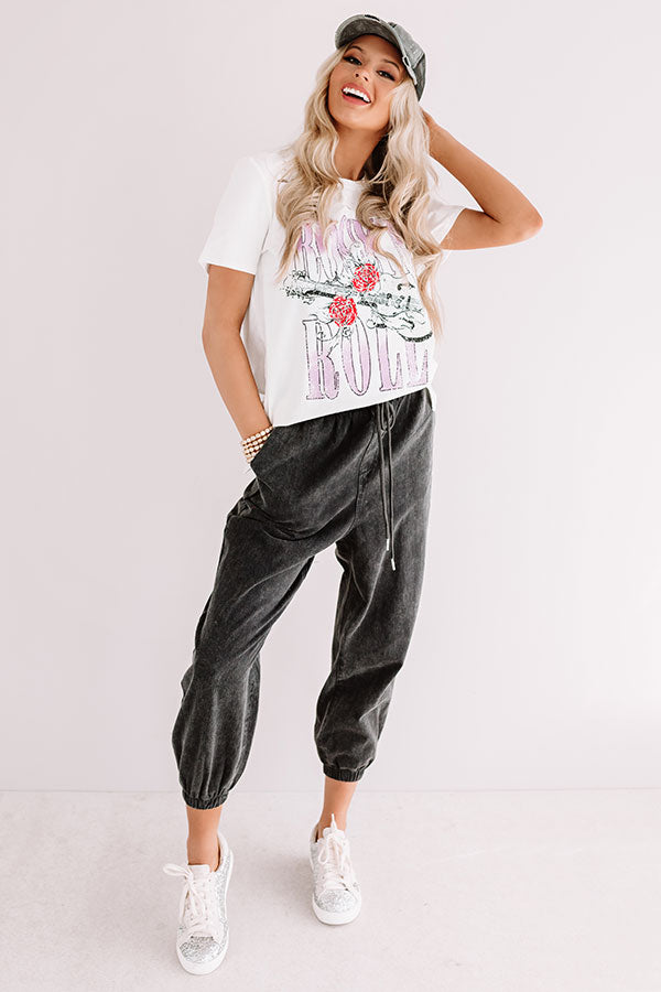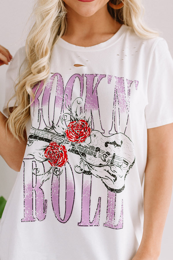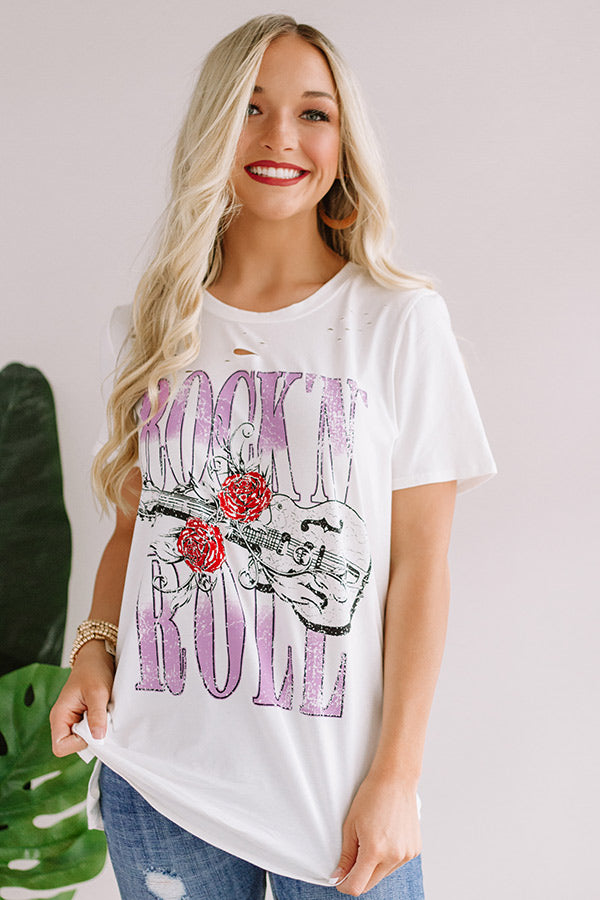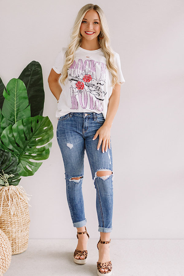 "Rock and roll" all day long in this adorable white boyfriend tee featuring soft lightweight cotton material with subtle distressed detailing, a high rounded neckline, short loose sleeves, an cute rose and guitar front graphic, pink accent lettering, and a relaxed silhouette that falls into a straight hemline! You can style this piece up with some distressed light wash skinnies and leopard wedges, or you can dress it down with our some black joggers and a trendy sneaker and baseball cap! Measurements